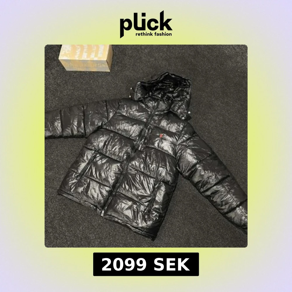 Säljer en svart pufferjacka från Polo Ralph Lauren med glansig finish och huva. Jackan har två framfickor med dragkedja, elastiska muddar och klassisk röd Polo-logga på bröstet. Perfekt för kalla dagar och har en riktigt schysst streetstil.