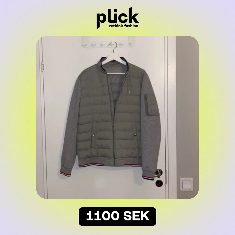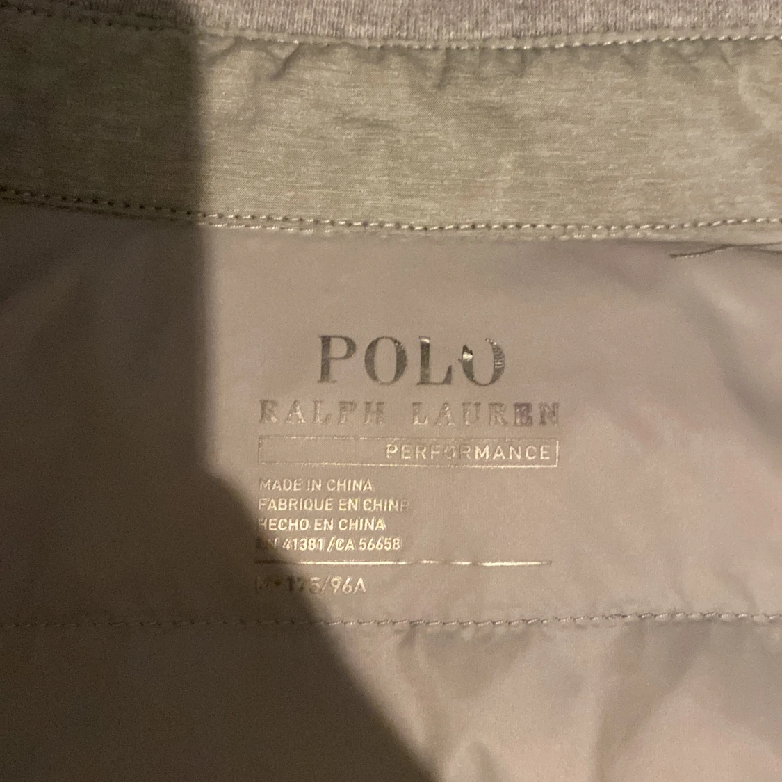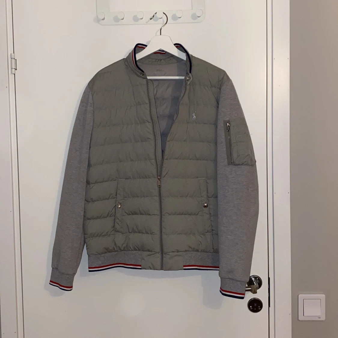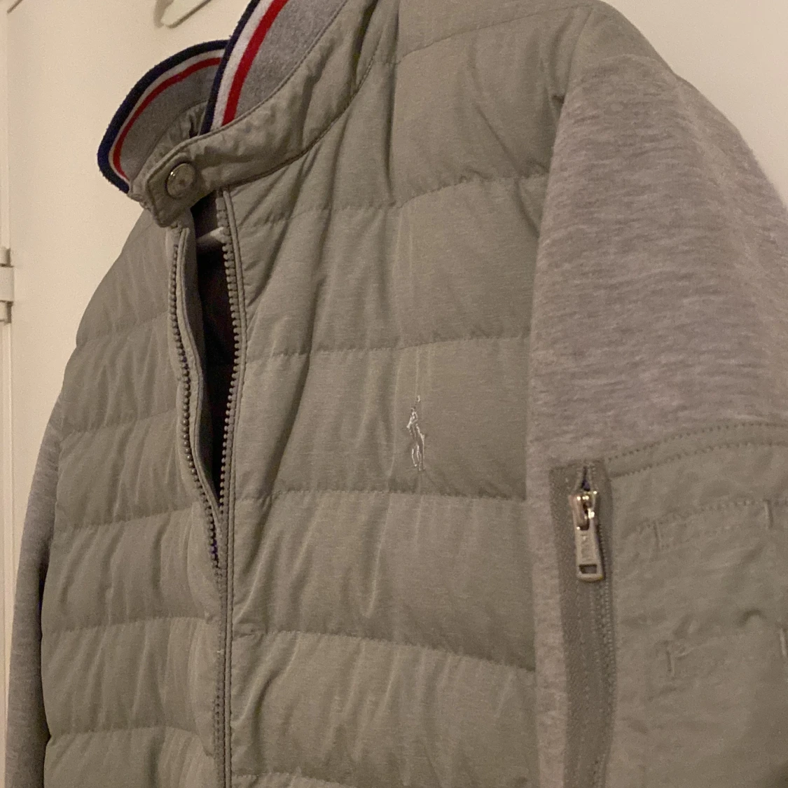 Säljer en snygg grå jacka från Polo Ralph Lauren. Den har en quiltad design på framsidan och mjuka grå ärmar. Jackan har en dragkedja framtill och en praktisk ficka med dragkedja på ärmen. Den är i storlek M