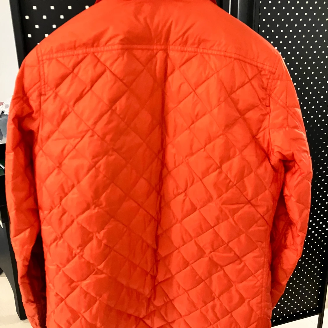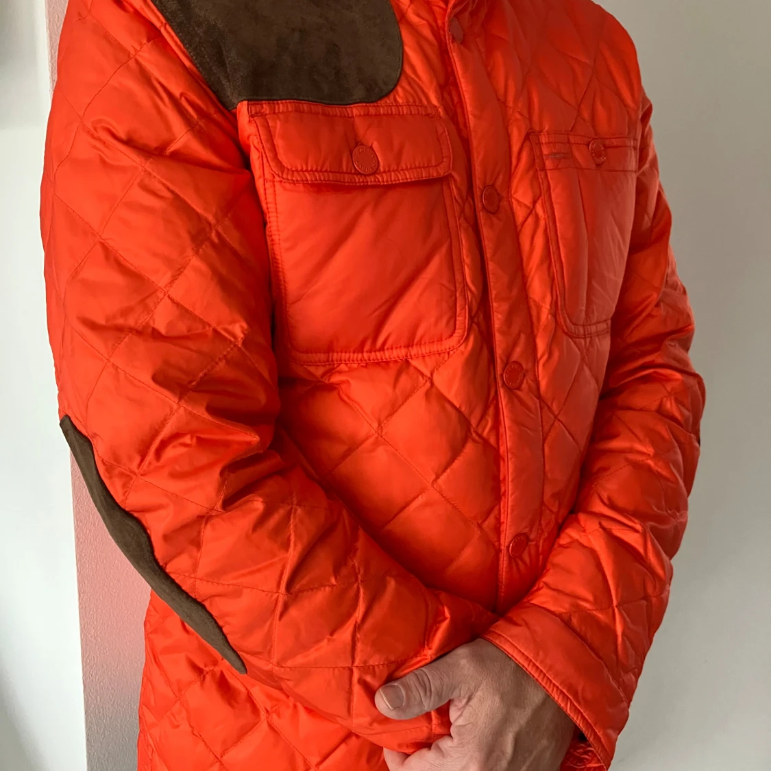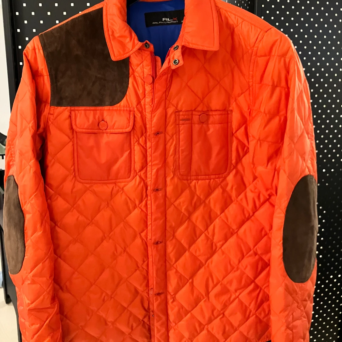 Quiltad orange jacka från RLX Ralph Lauren med bruna mockadetaljer på axel och armbågar. Två bröstfickor med knappstängning och klassisk krage. Jackan har en sportig streetvibe och är tillverkad i polyester med inslag av mocka. Nypris ca 3000-4000kr.