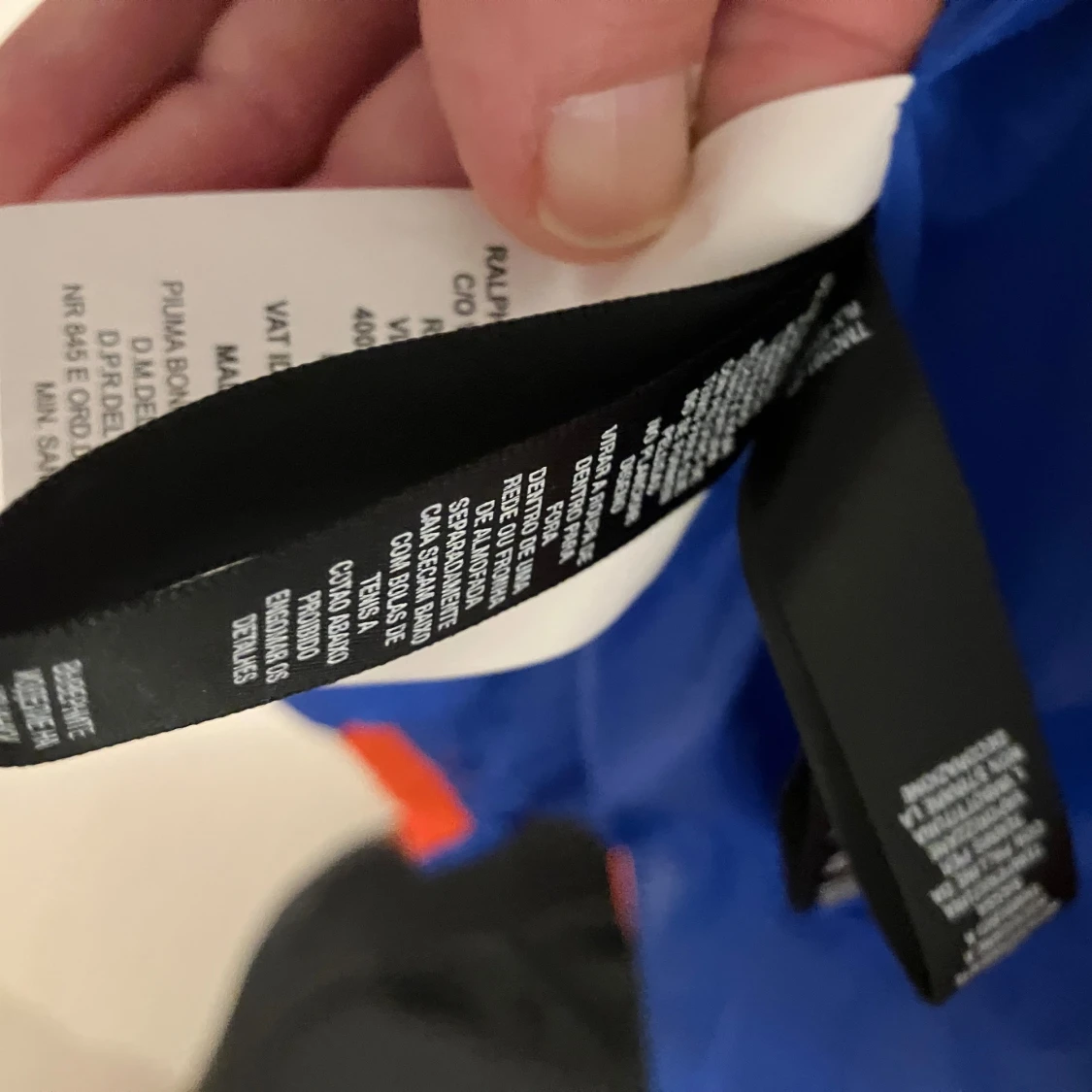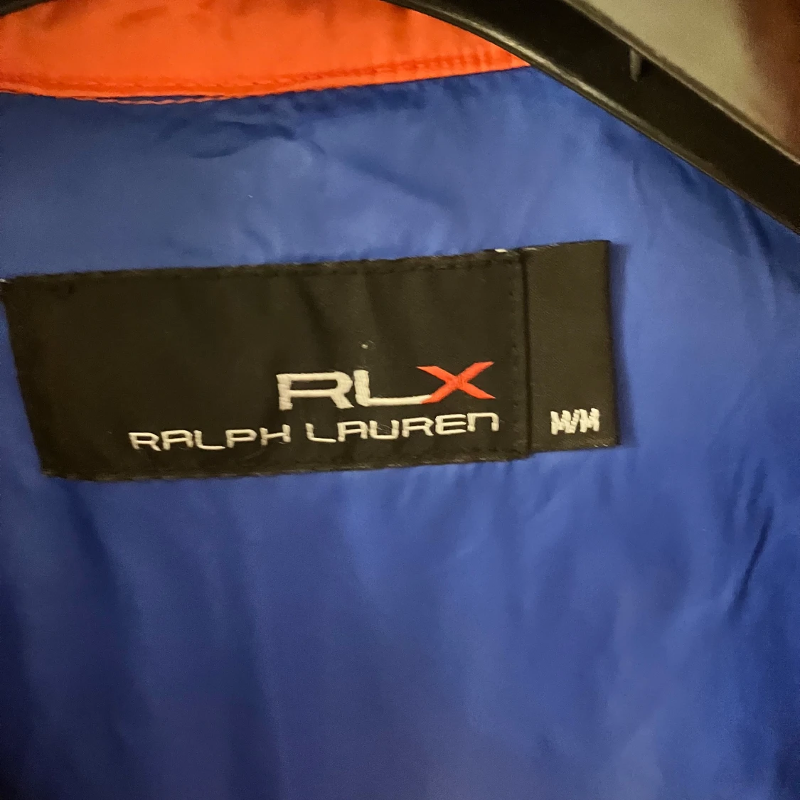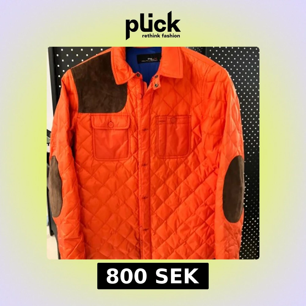 Quiltad orange jacka från RLX Ralph Lauren med bruna mockadetaljer på axel och armbågar. Två bröstfickor med knappstängning och klassisk krage. Jackan har en sportig streetvibe och är tillverkad i polyester med inslag av mocka. Nypris ca 3000-4000kr.