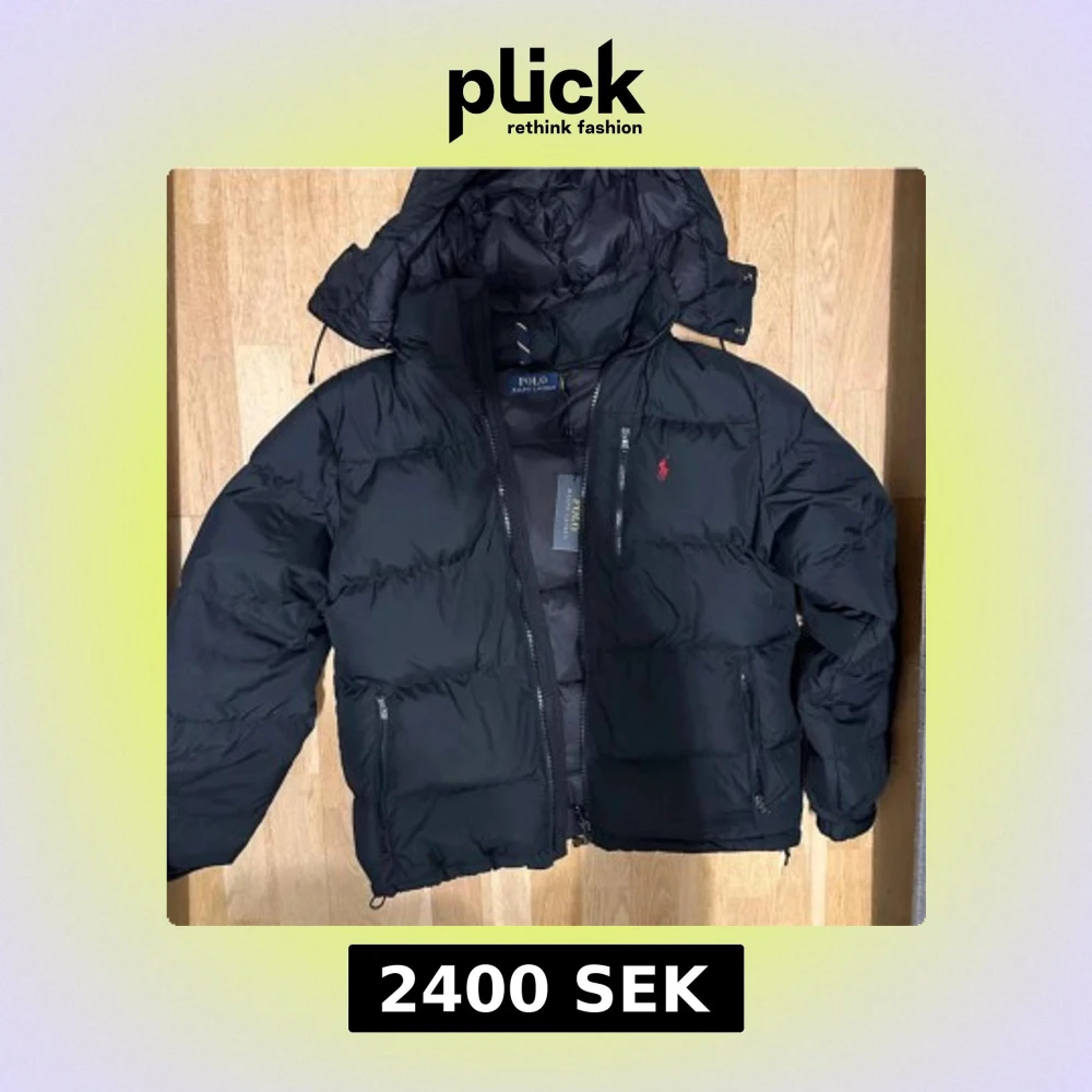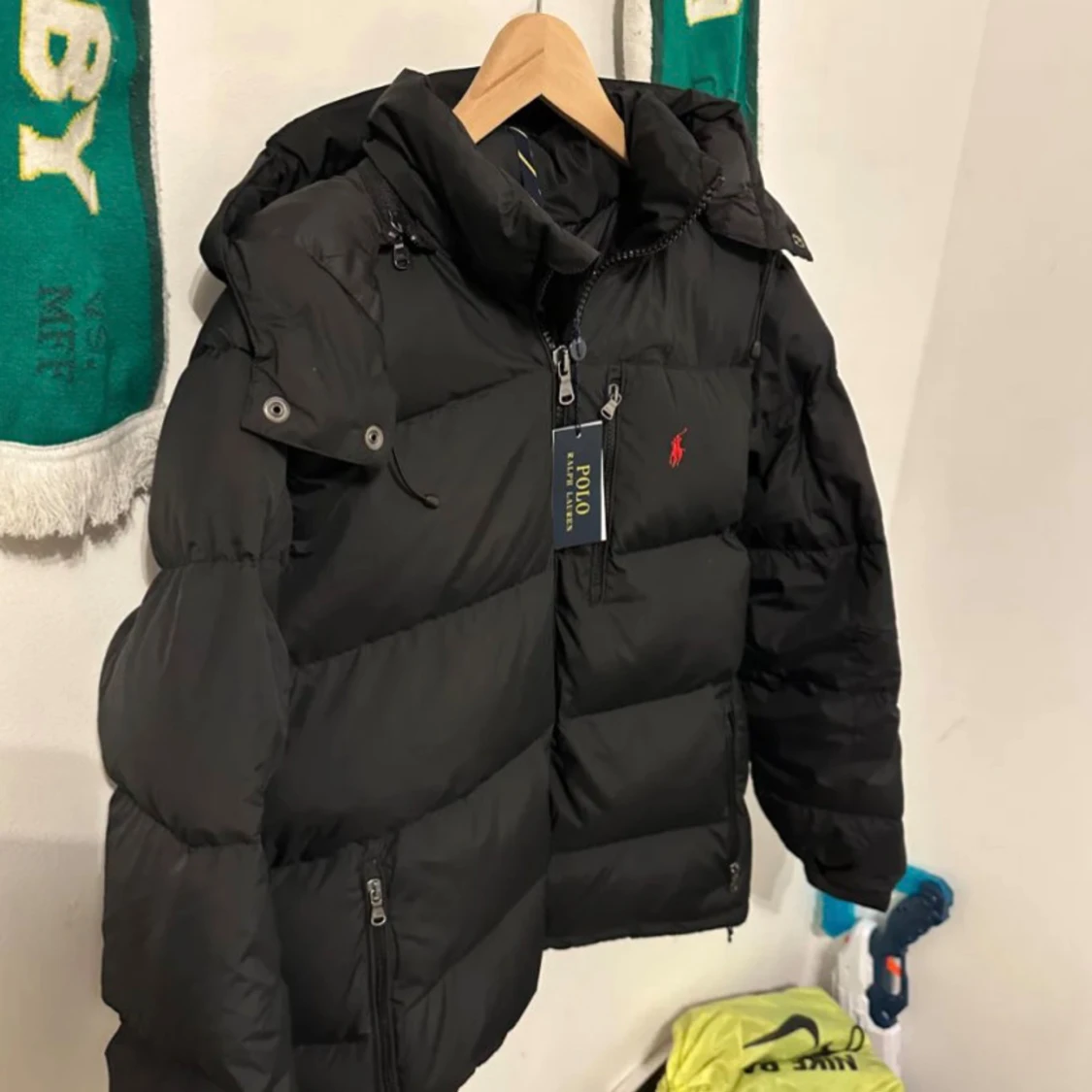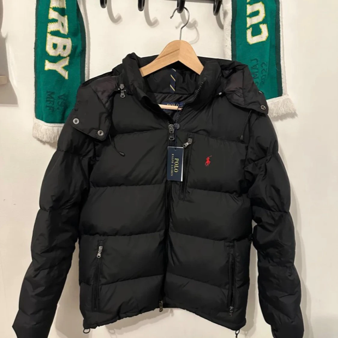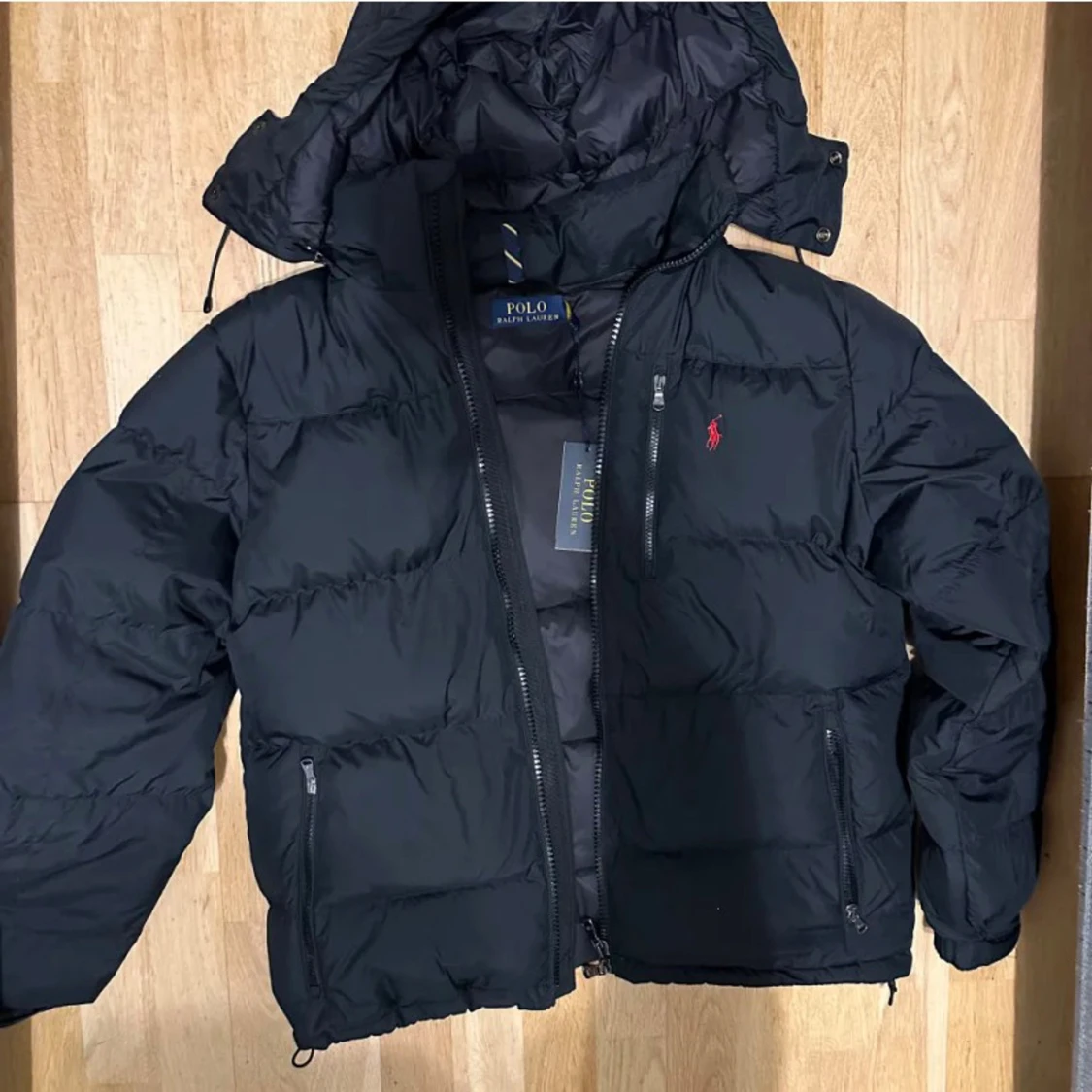 Svart dunjacka från Polo Ralph Lauren med avtagbar huva, dragkedjor på fickor och bröst, samt röd broderad logga på bröstet. Jackan är quiltad och har en klassisk pufferstil som håller dig varm under kalla dagar.