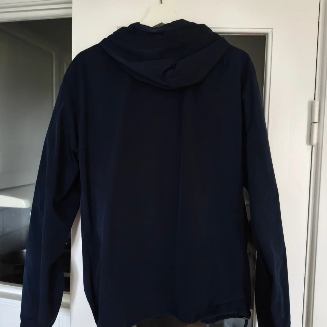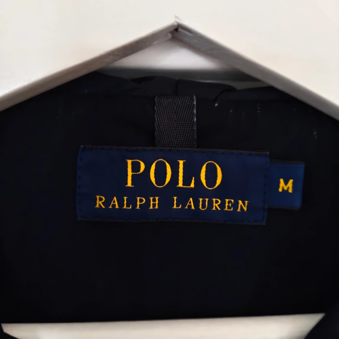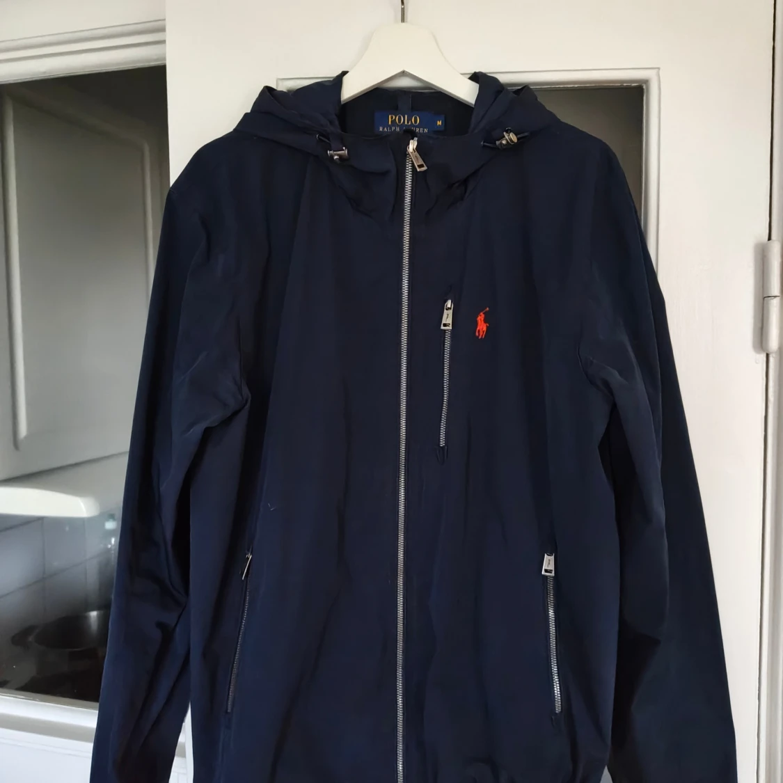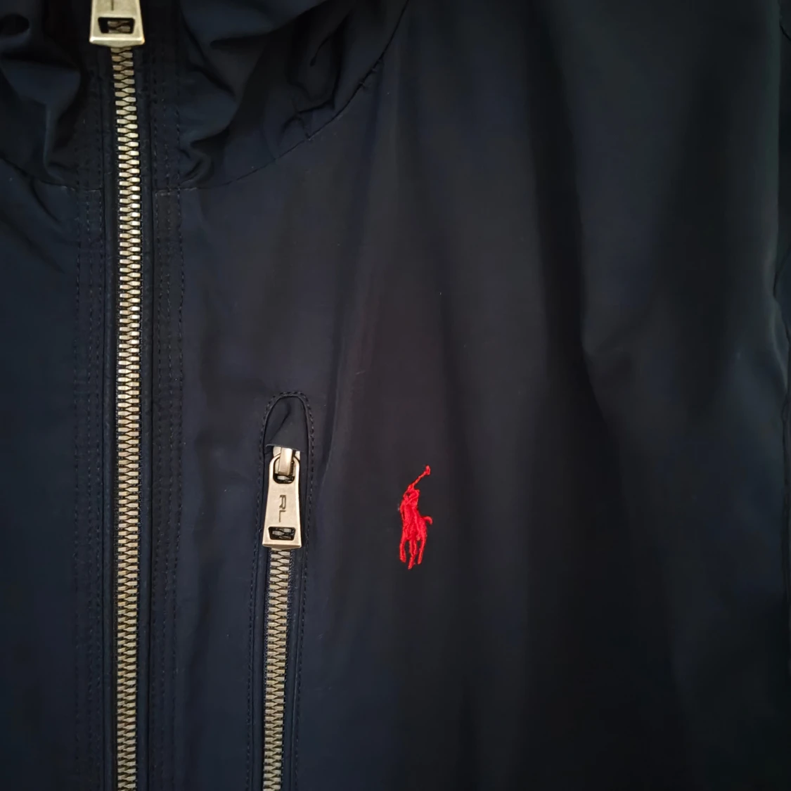 Marinblå vindjacka från Polo Ralph Lauren med huva, dragkedja framtill och två sidofickor med dragkedja. Klassisk röd broderad logga på bröstet. Jackan har en stilren look och är tillverkad i lätt polyester, perfekt för blåsiga dagar.