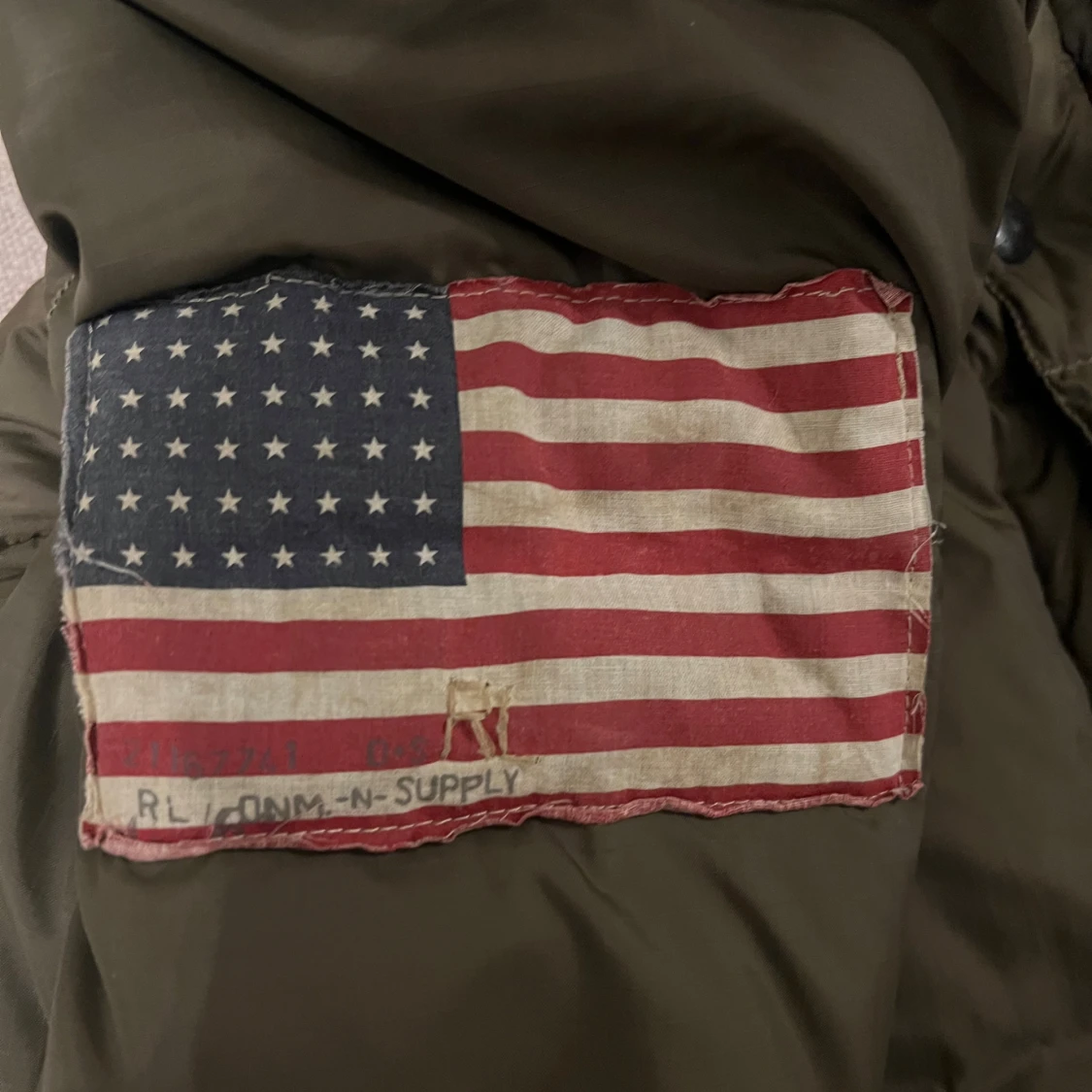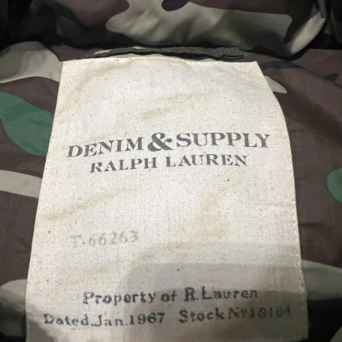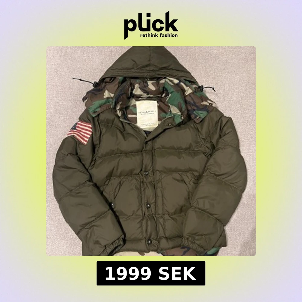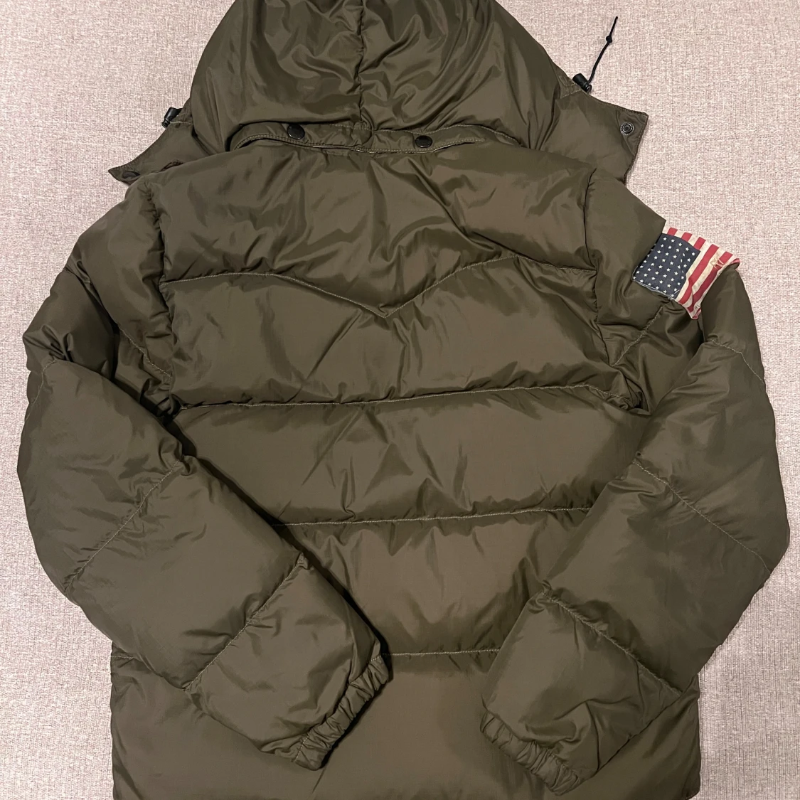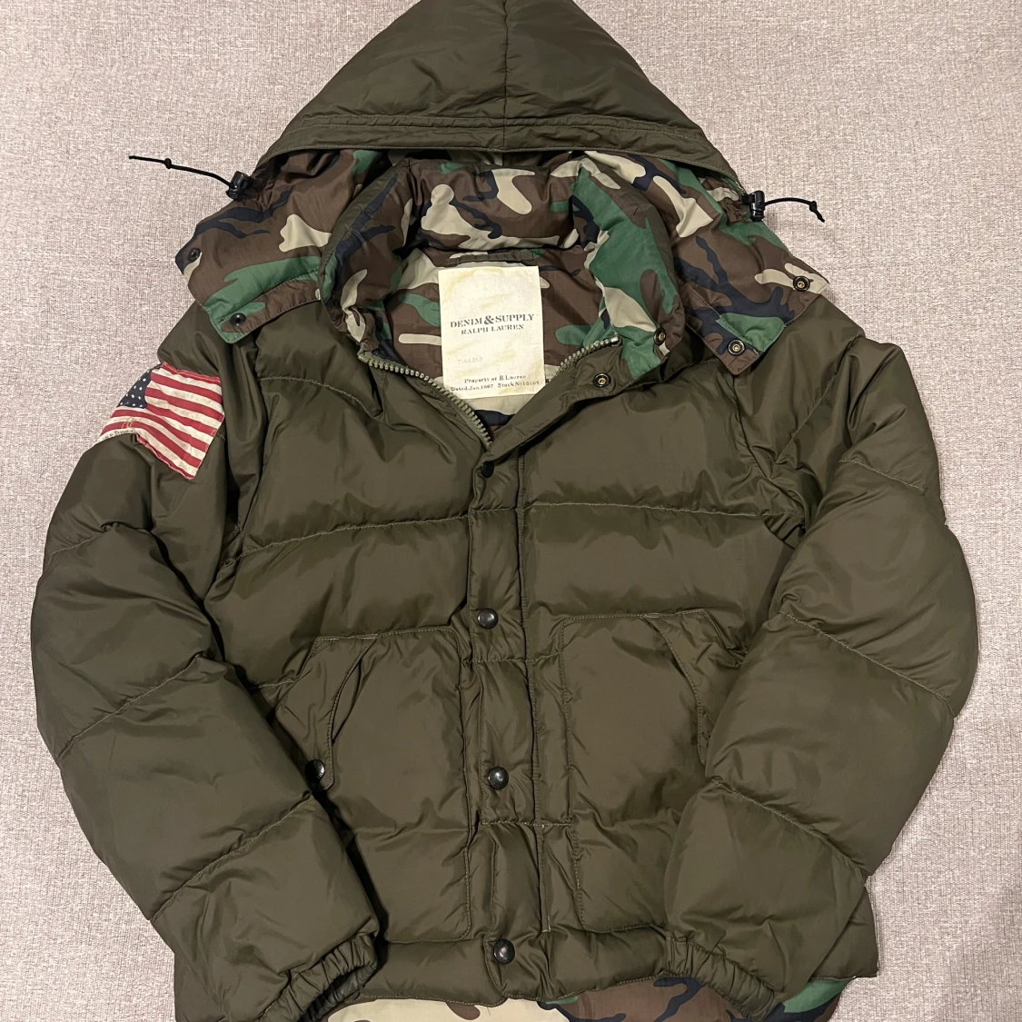 Säljer en grön pufferjacka från Ralph Lauren Denim & Supply med camo-detaljer i huvan och stor amerikansk flagga på ärmen. Jackan har huva, dragkedja och knappar framtill samt två stora fickor. Perfekt för kalla dagar och riktigt snygg streetstil. Storlek M