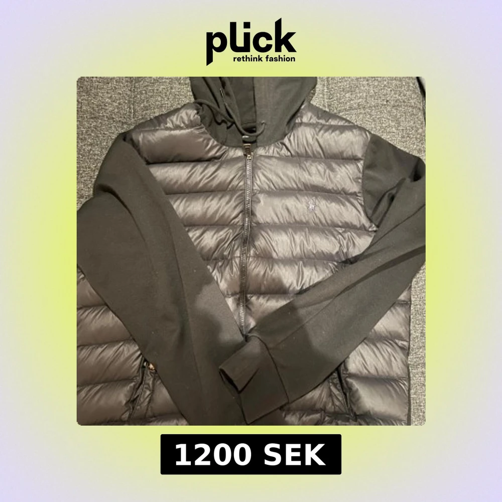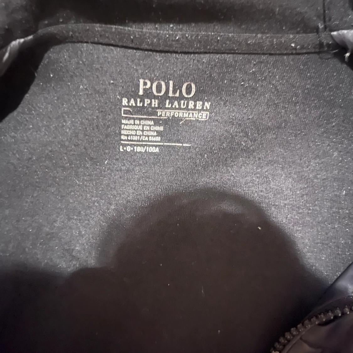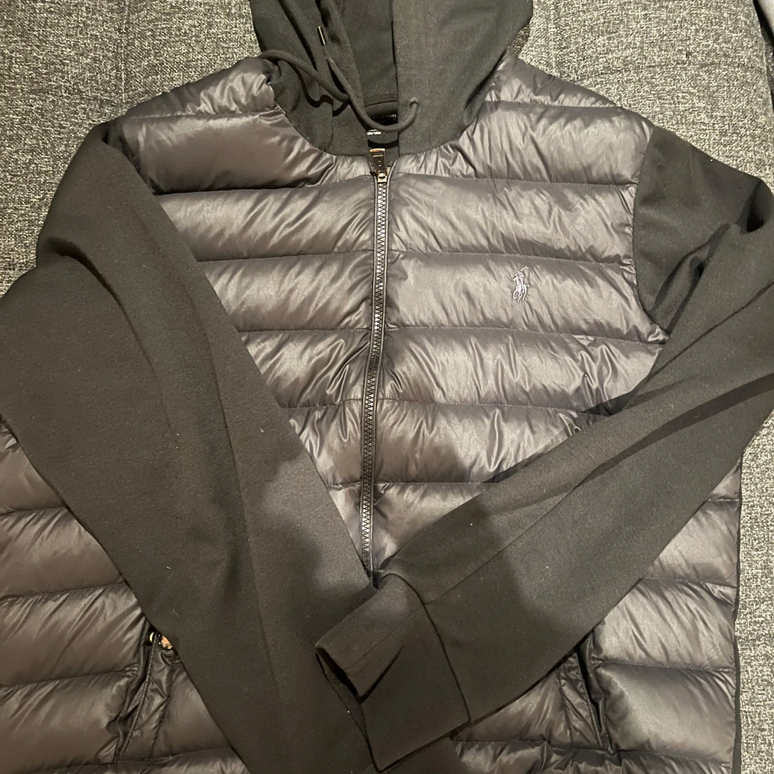Säljer en svart pufferjacka från Polo Ralph Lauren med huva och dragkedja. Jackan har quiltad framsida i glansigt material och ärmar samt rygg i mjuk bomull. Perfekt för kyliga dagar.