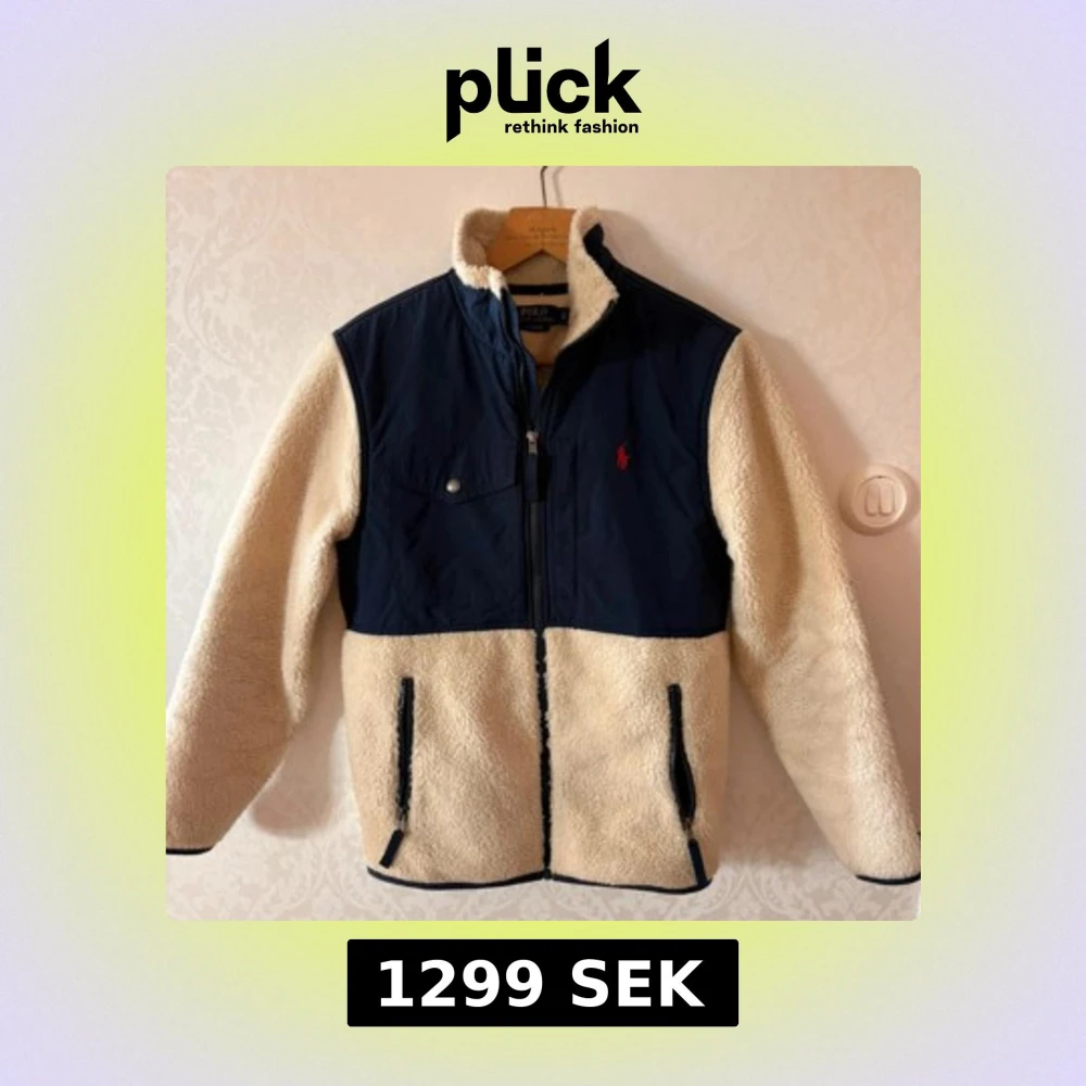 Snygg teddyjacka från Polo Ralph Lauren i beige och mörkblått. Jackan har dragkedja, hög krage och två fickor framtill. Materialet är mjuk fleece med detaljer i polyester och klassisk röd logga på bröstet. Perfekt för kalla dagar och chill stil.