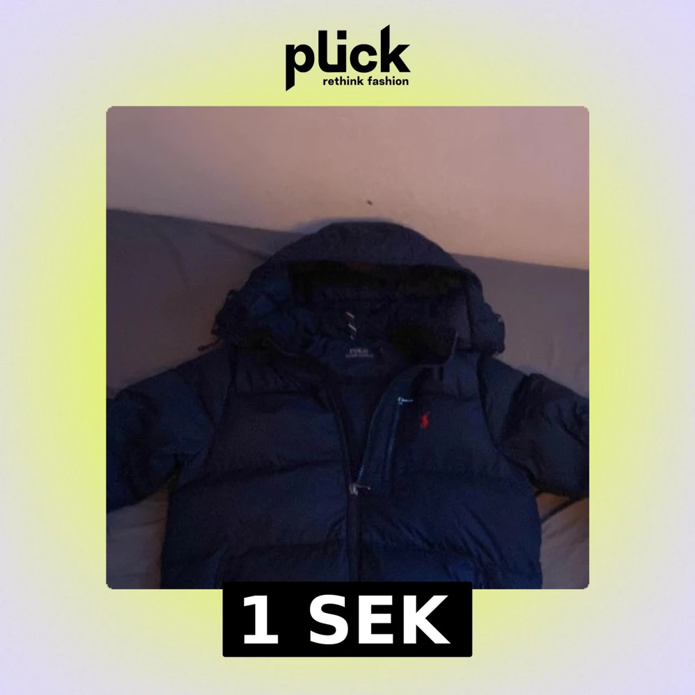 Säljer en snygg mörkblå dunjacka från Polo Ralph Lauren med huva och dragkedja. Jackan har en liten röd logotyp på bröstet och är perfekt för kyliga dagar.