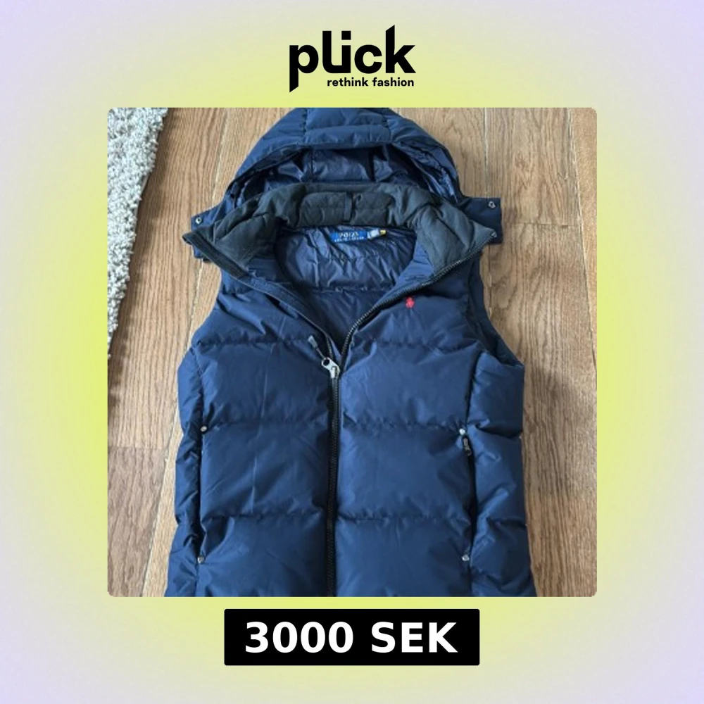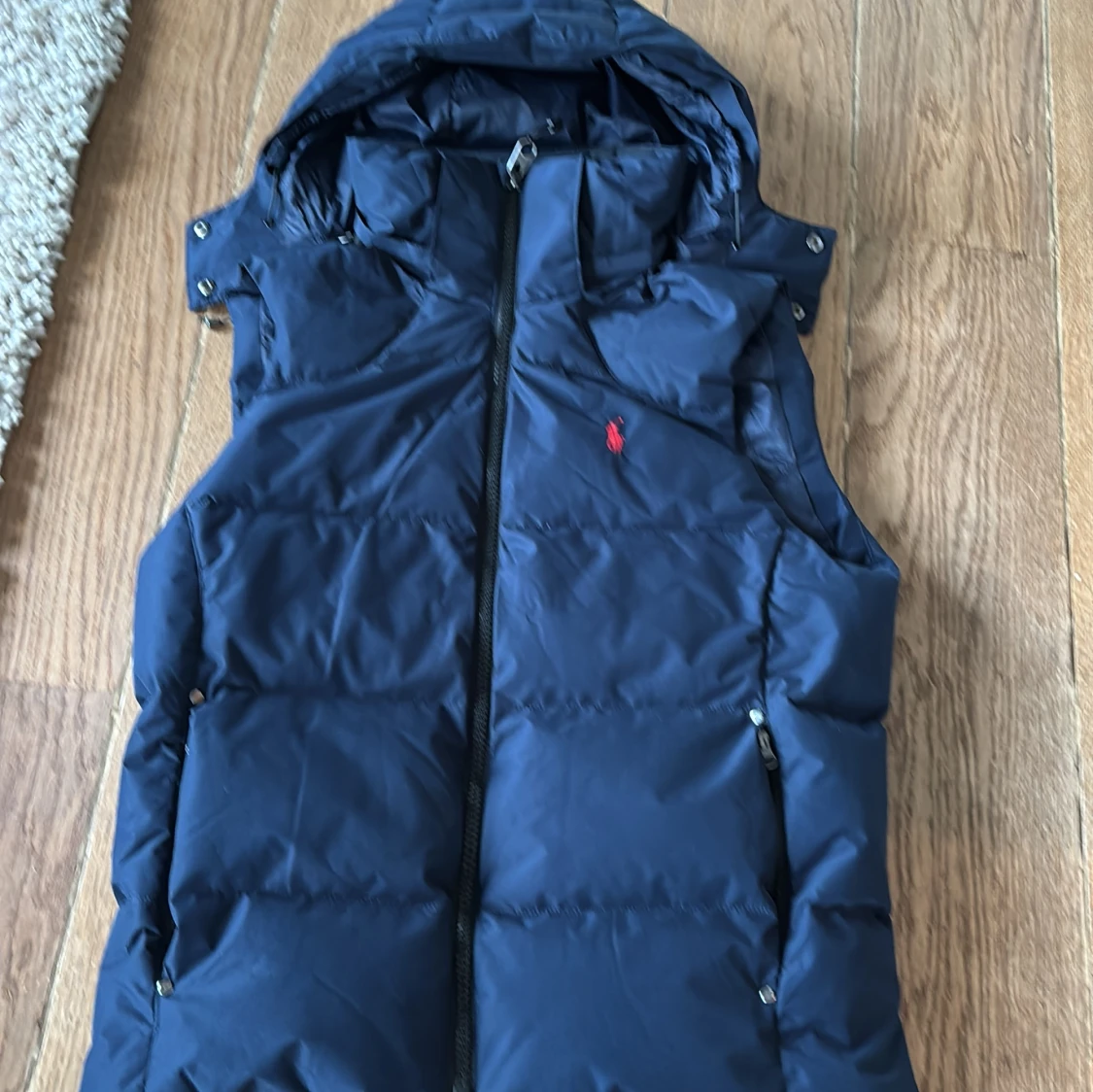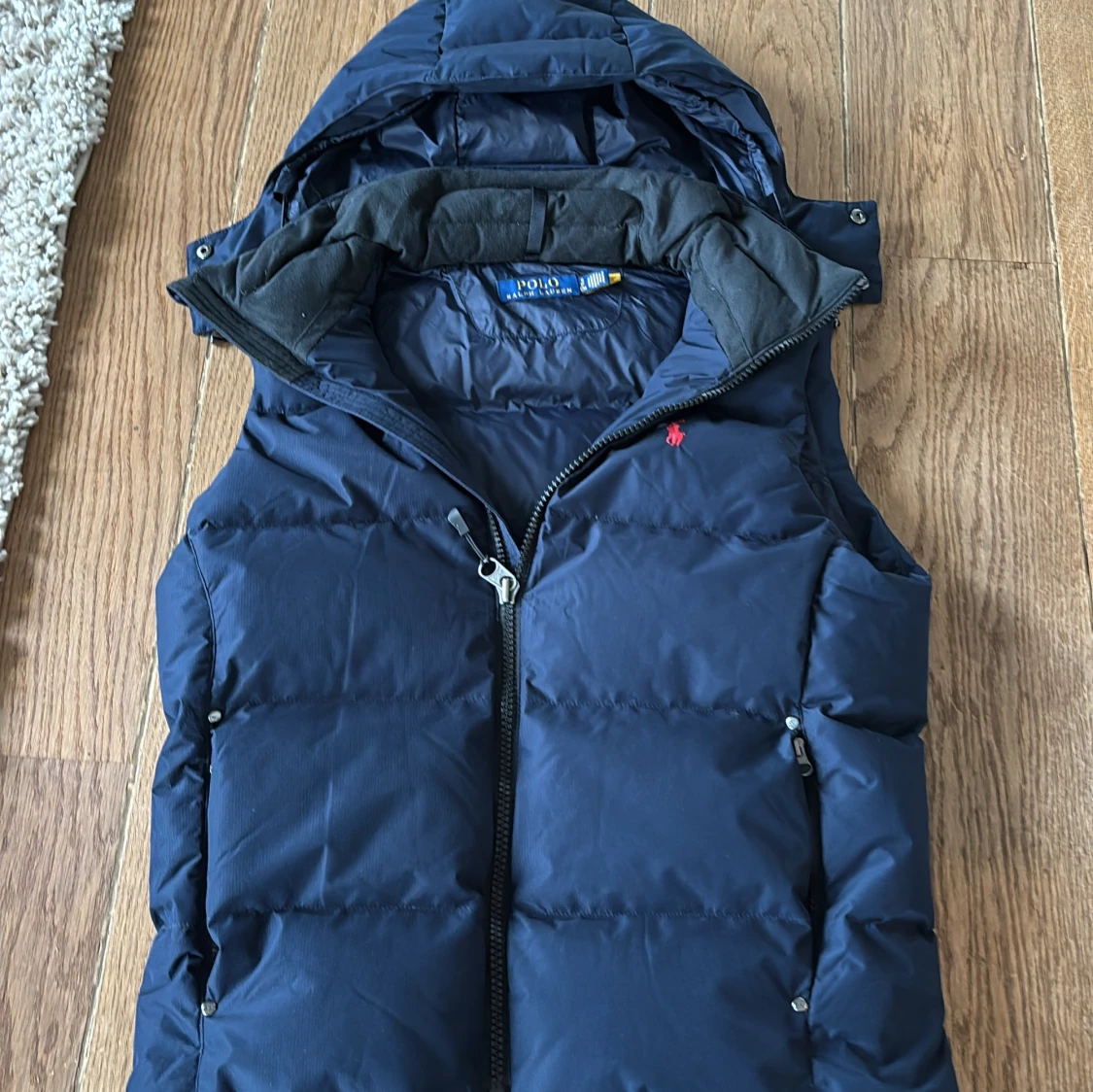 Snygg mörkblå dunväst från Polo Ralph Lauren med avtagbar huva och dragkedja framtill. Den är bara andvänd 4 gånger. Ny pris är 4500