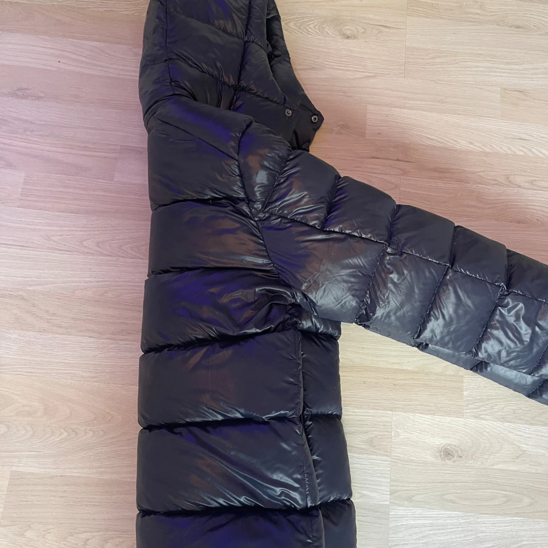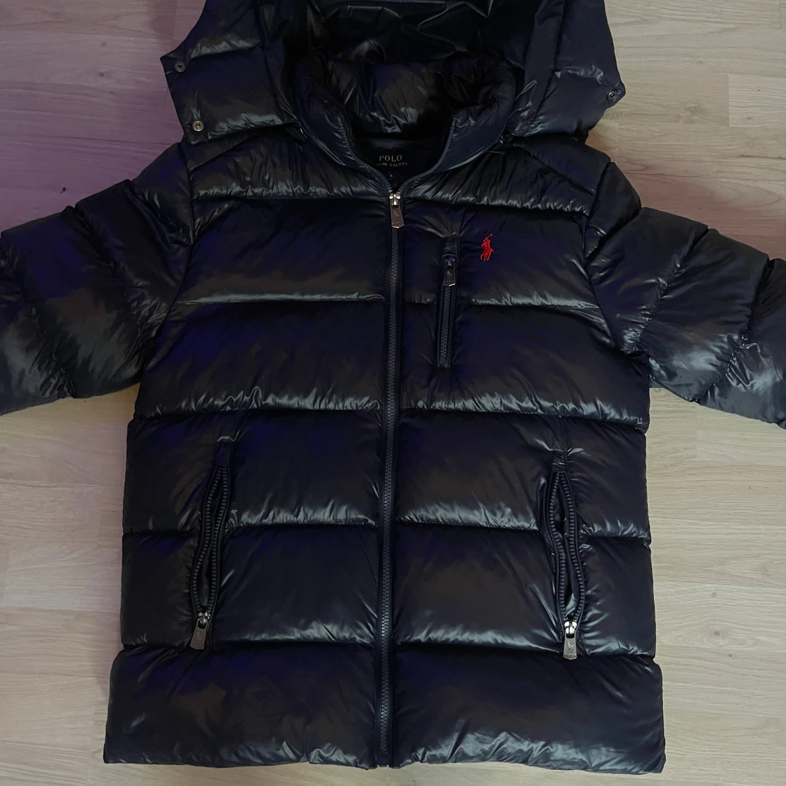 Svart pufferjacka från Polo Ralph Lauren med röd logga på bröstet. Jackan har huva, dragkedja framtill och tre fickor med dragkedja. Den är vadderad och har en glansig finish, perfekt för kalla dagar.