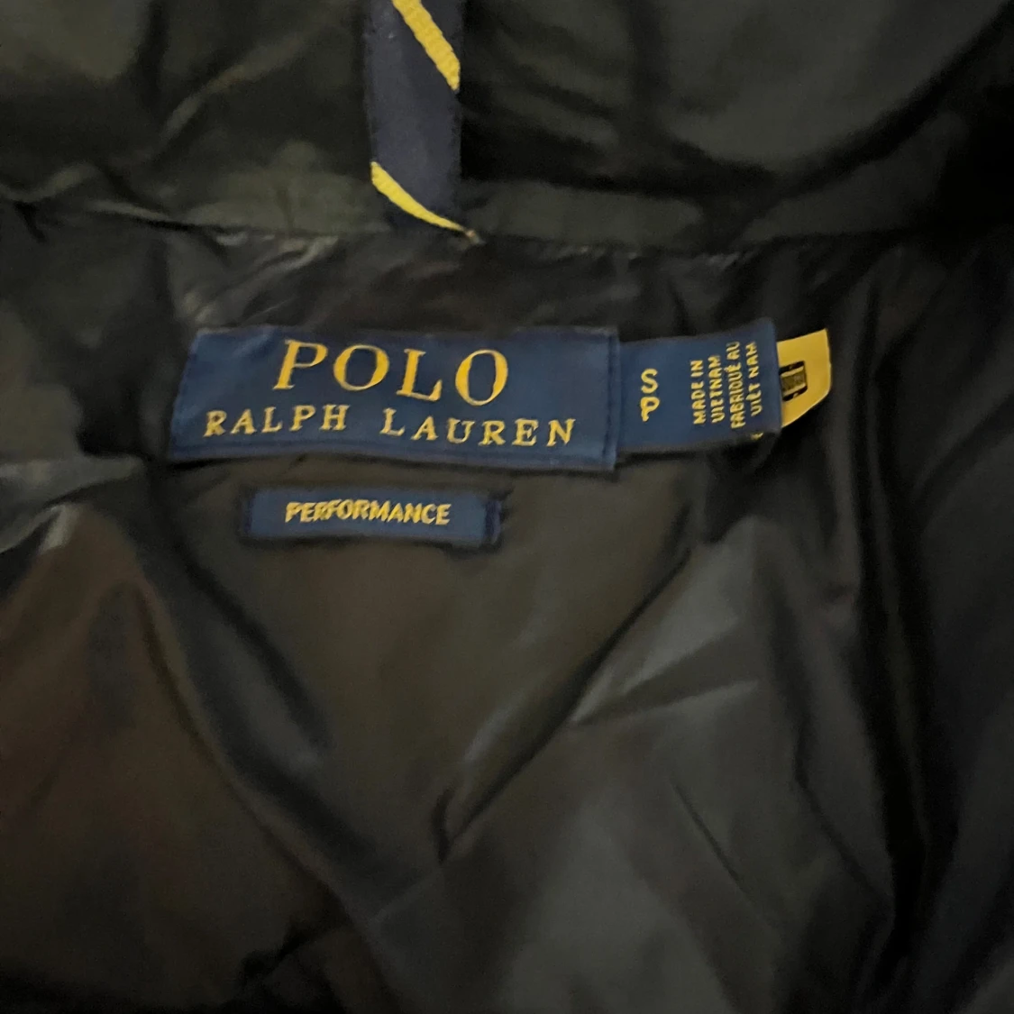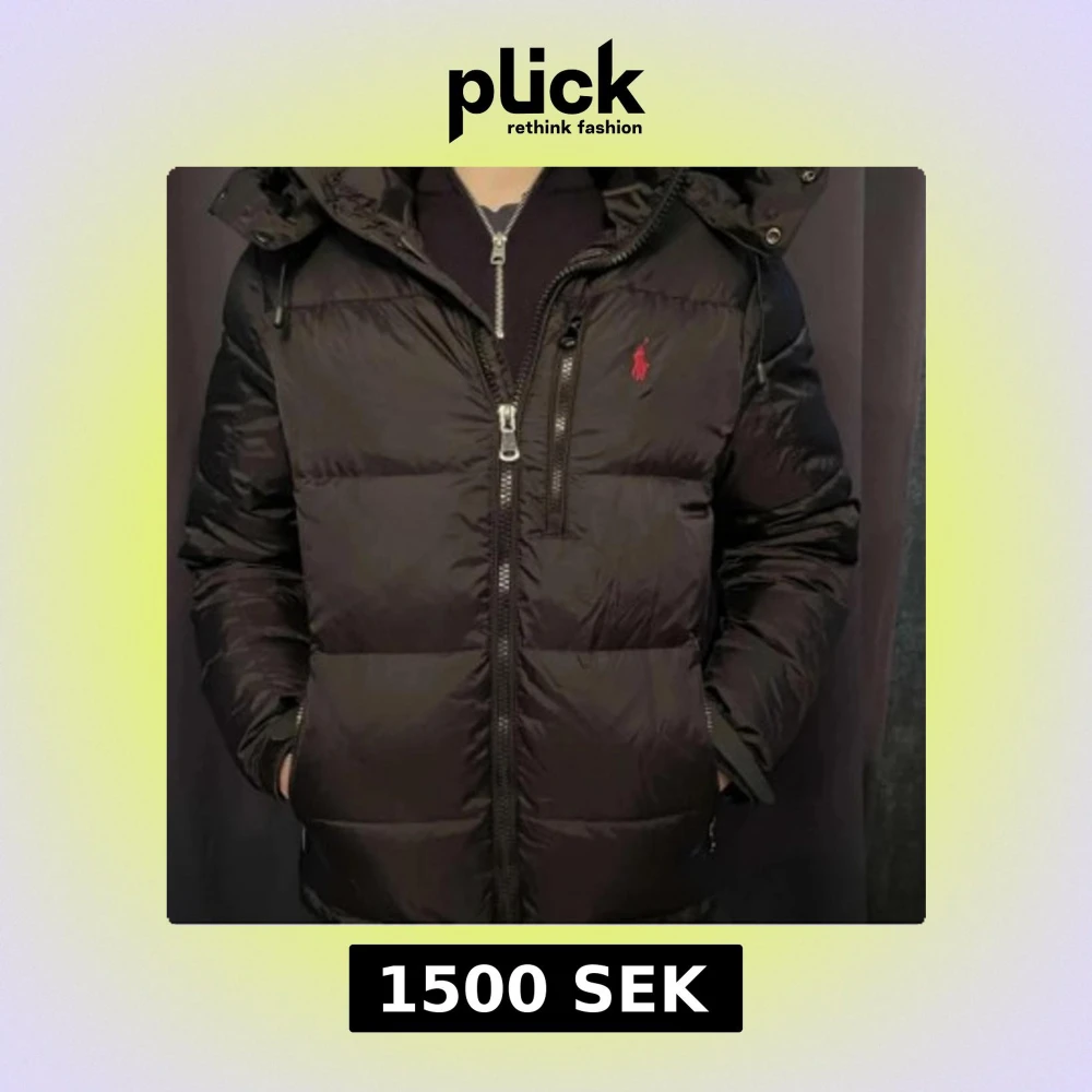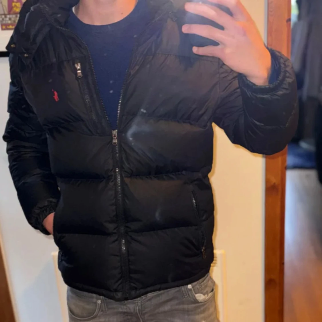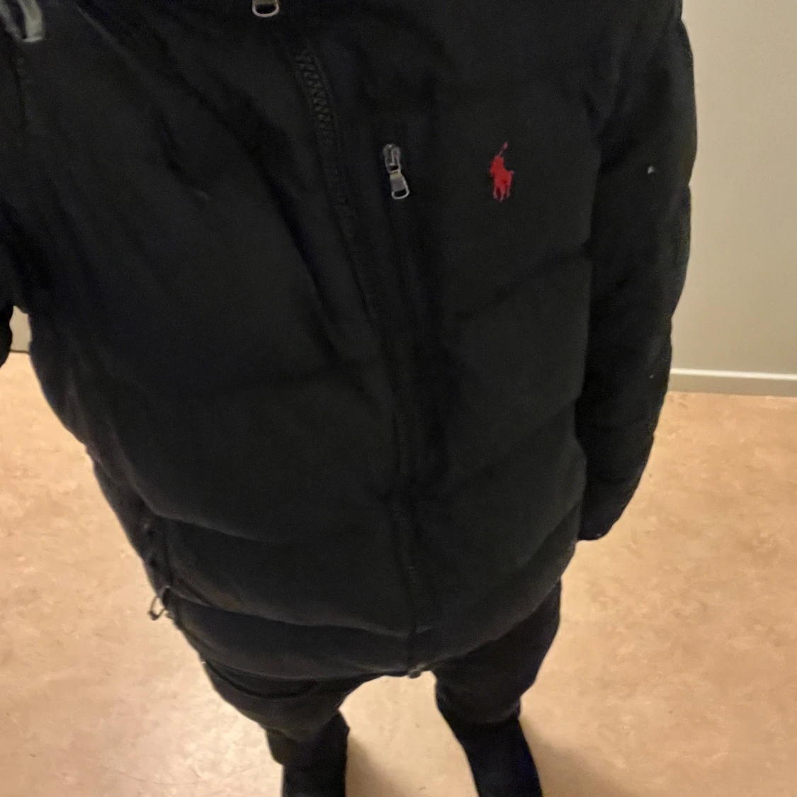 Säljer en svart dunjacka från Ralph Lauren med röd logga på bröstet. Jackan har huva, dragkedja framtill och flera fickor med dragkedja. Puffig modell som håller dig varm och snygg under kalla dagar. Perfekt för dig som gillar stilren och sportig look. Små slitningar finns