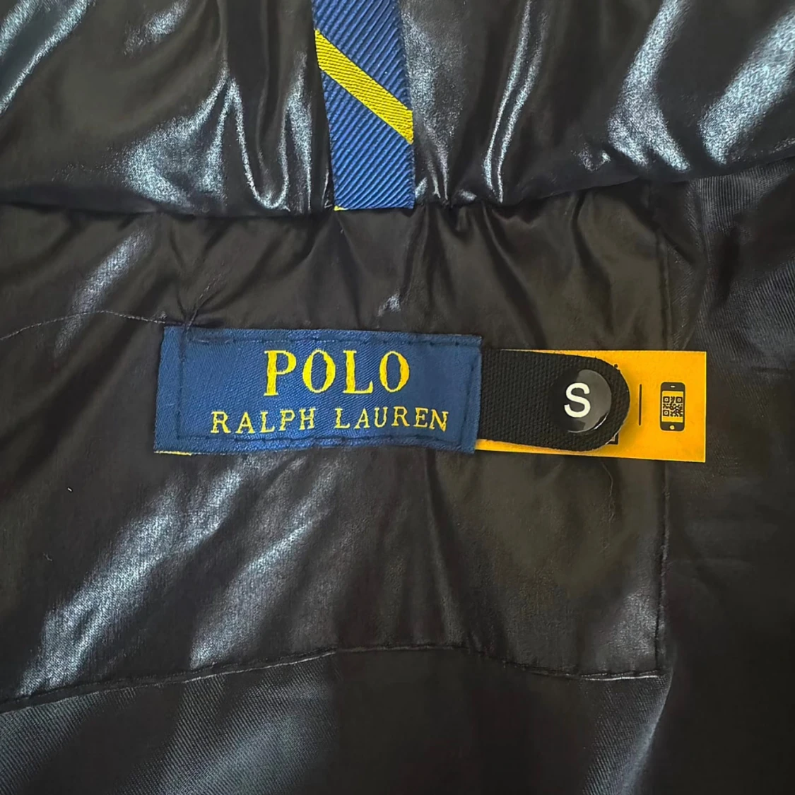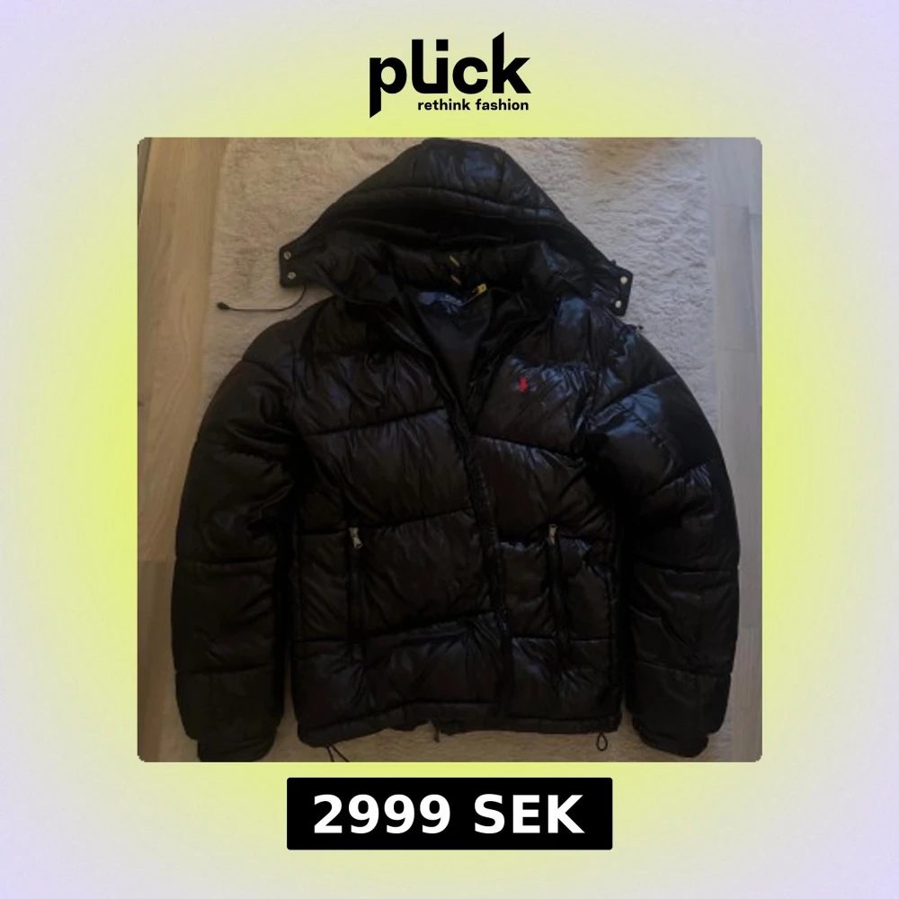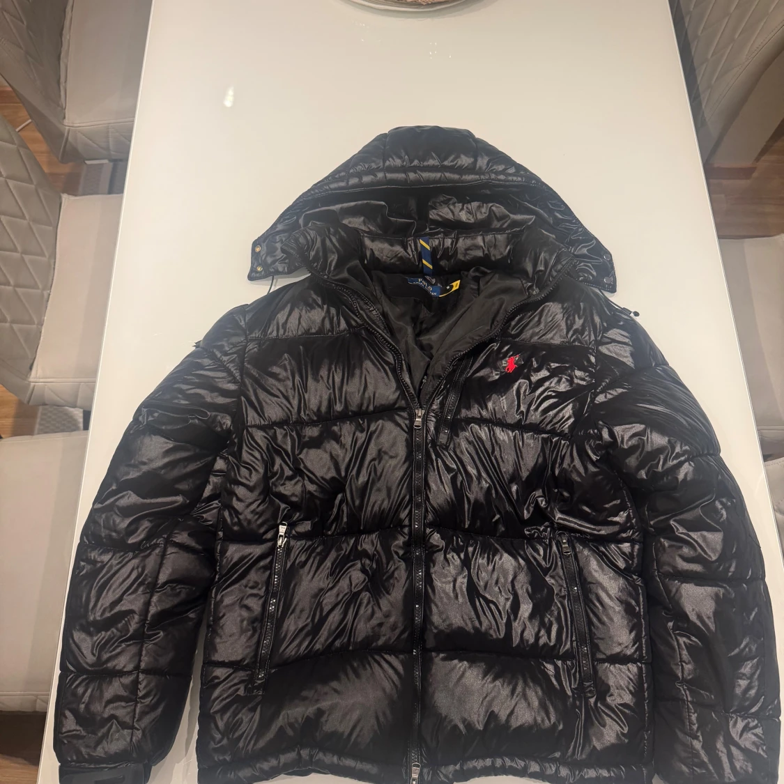 Svart pufferjacka från Polo Ralph Lauren (OANVÄND) med glansig finish och röd logga på bröstet. Jackan har huva, två dragkedjeförsedda fickor och justerbar snörning nedtill. Perfekt för kalla dagar och har en riktigt chill vibe.