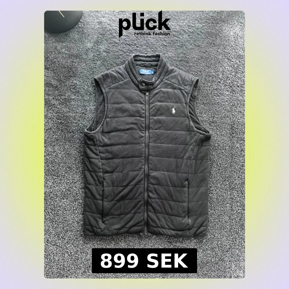 Svart quiltad dunväst från Polo Ralph Lauren med ståkrage och dragkedja framtill. Västen har ett broderat vitt Polo-logotyp på bröstet och en knappdetalj vid halsen. Perfekt att slänga över en hoodie för en chill look. Skick 8/10, storlek M. Pris går att diskutera✅