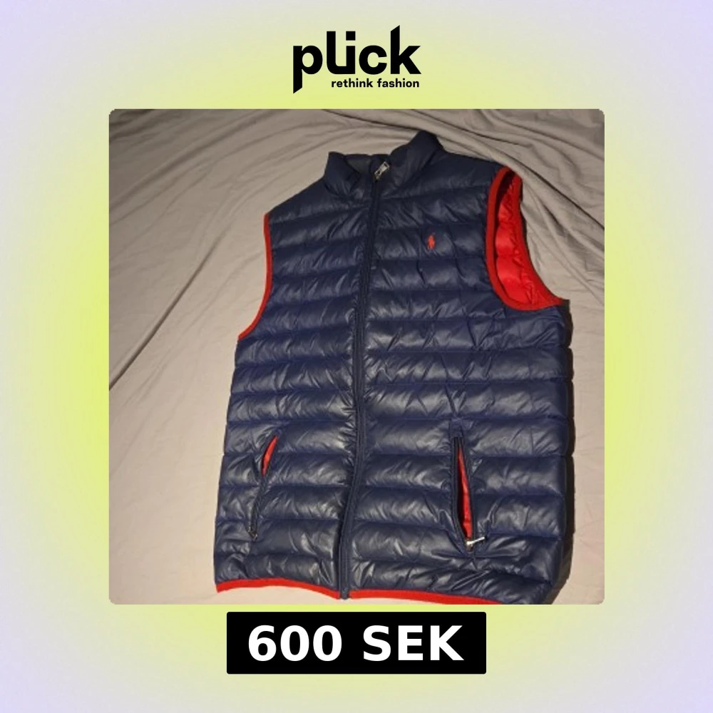 Snygg blå dunväst från Polo Ralph Lauren med röda detaljer och dragkedja framtill. Västen har quiltad design, två fickor med dragkedja och röd logga på bröstet. Perfekt för lager-på-lager och chill stil under höst och vinter. Är XL i storlek men funkar absolut för folk som är M och uppåt, själv är jag M och den sitter fint på mig.
