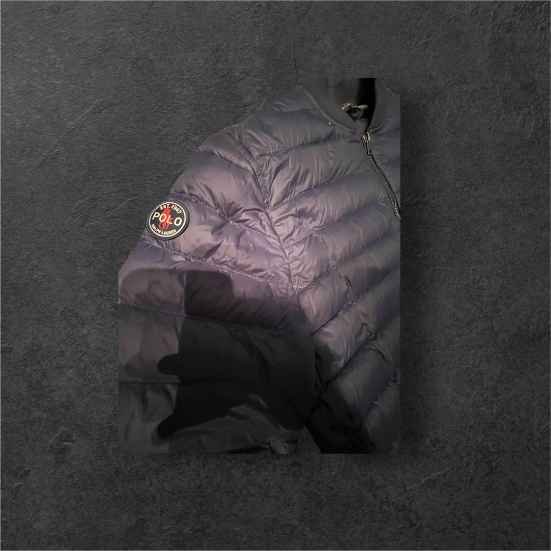Snygg mörkblå dunjacka från Polo Ralph Lauren med quiltad design och ribbade muddar. Jackan har dragkedja framtill, två fickor med tryckknapp och en ärmficka med dragkedja. Klassisk badge på ärmen och bomberjacke-inspirerad passform.