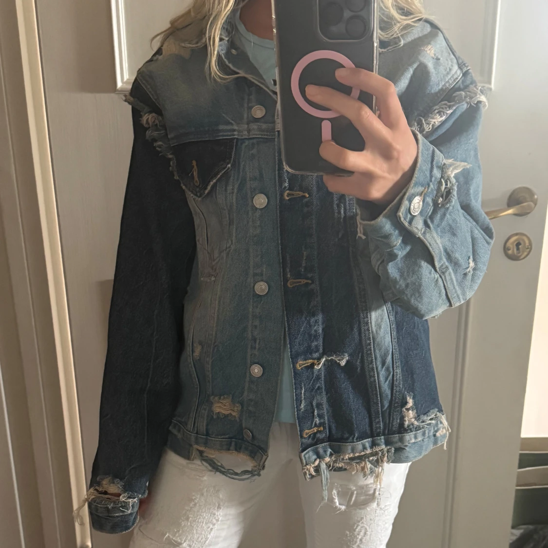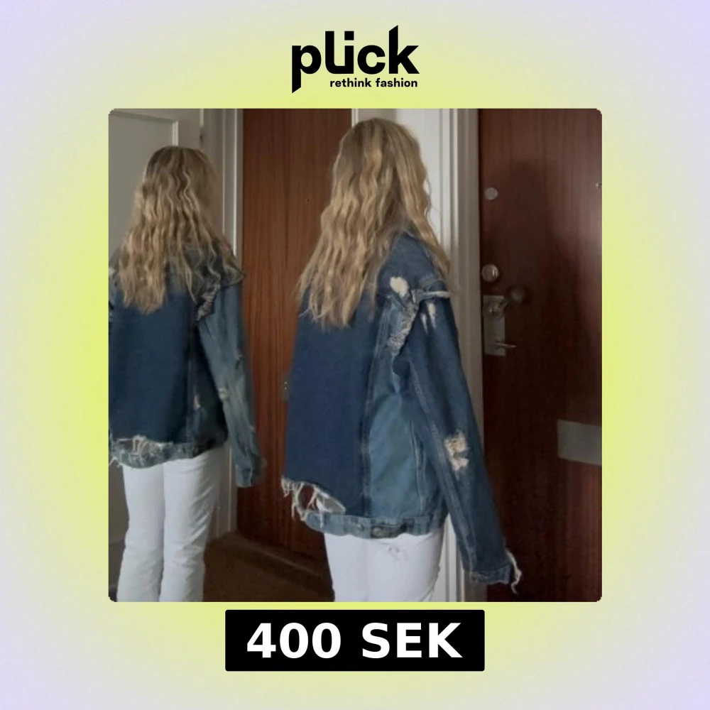 Säljer en riktigt cool jeansjacka, så sitter den på mig som vanligtvis har XS i storlek, men kan passa fler storlekar beroende på hur man vill den ska sitta. Den är i bra skick (alla slitningar ska vara som dom är) 💓