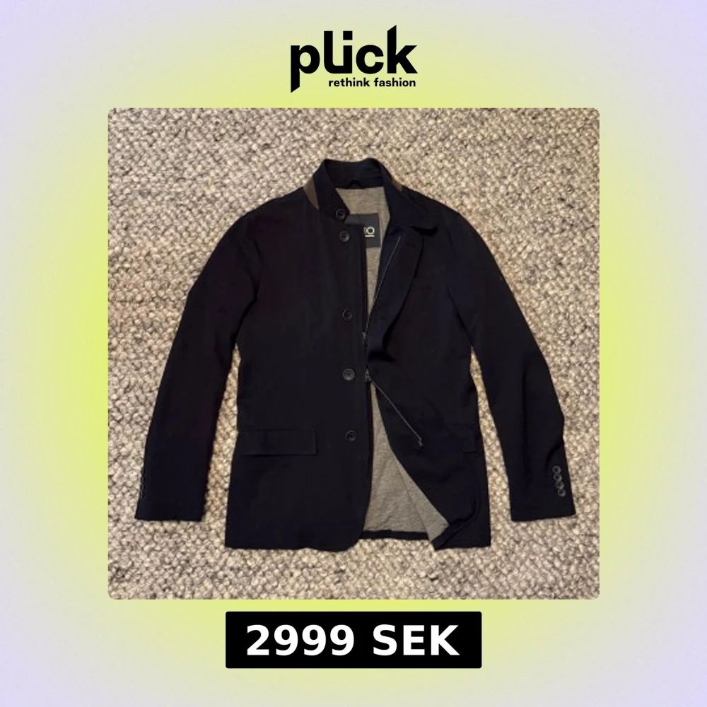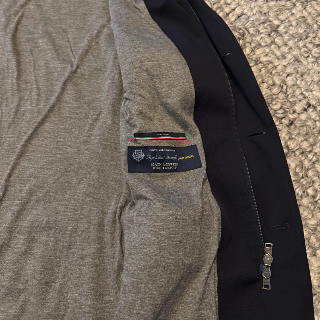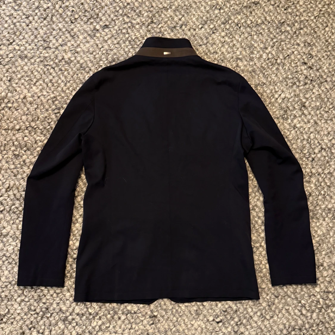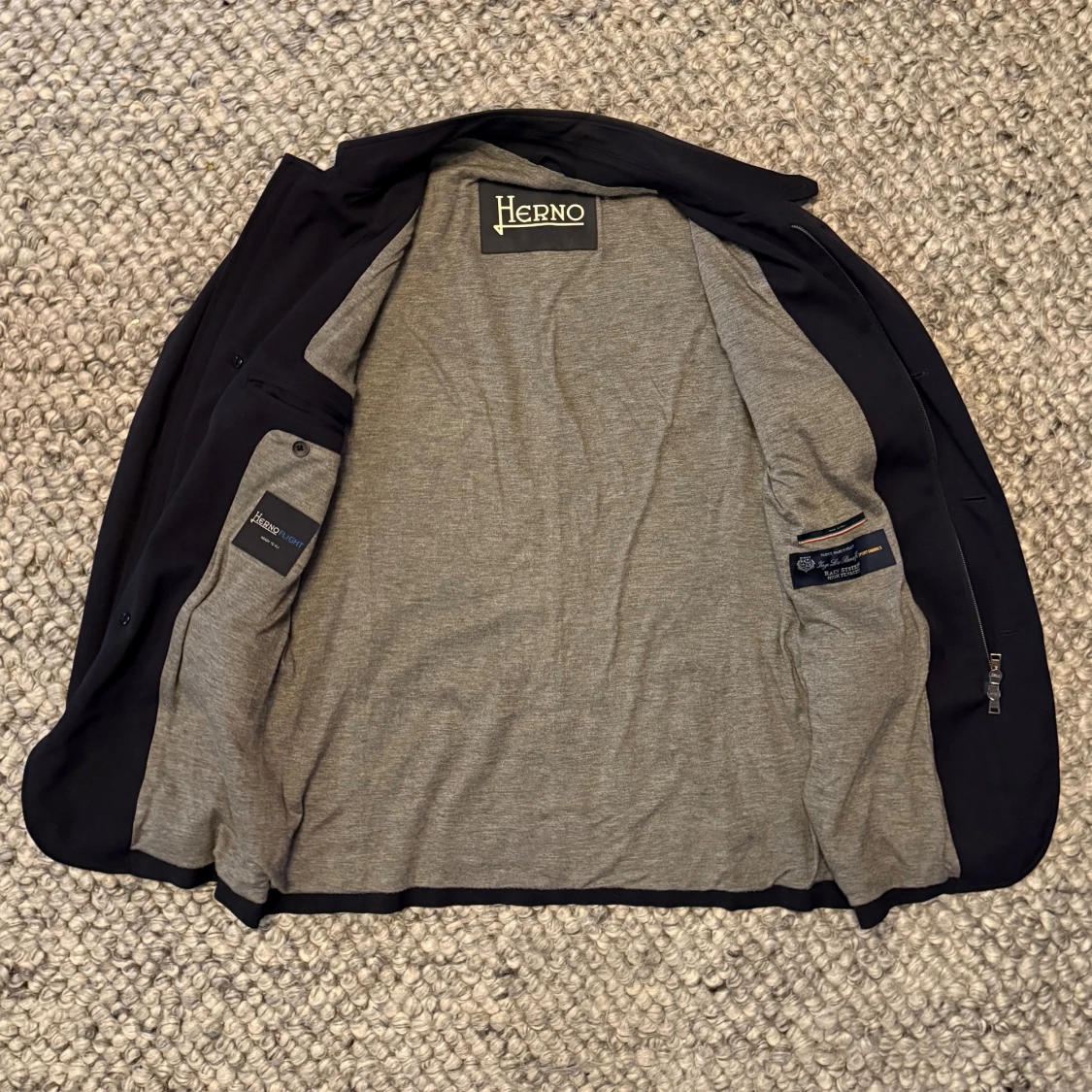 Stilren mörkblå kavajjacka från Herno med klassisk krage och knäppning framtill. Jackan har grått innerfoder och smart dragkedja under knapparna. Tillverkad i ett tekniskt material med Loro piana Rain System, perfekt för dig som vill ha en dressad look med modern twist.