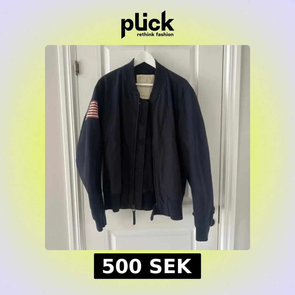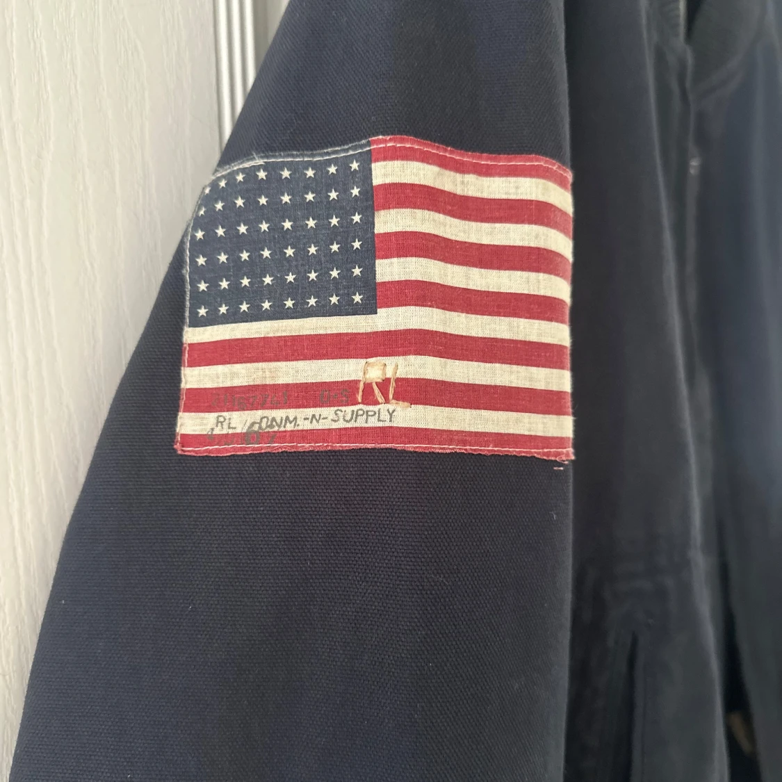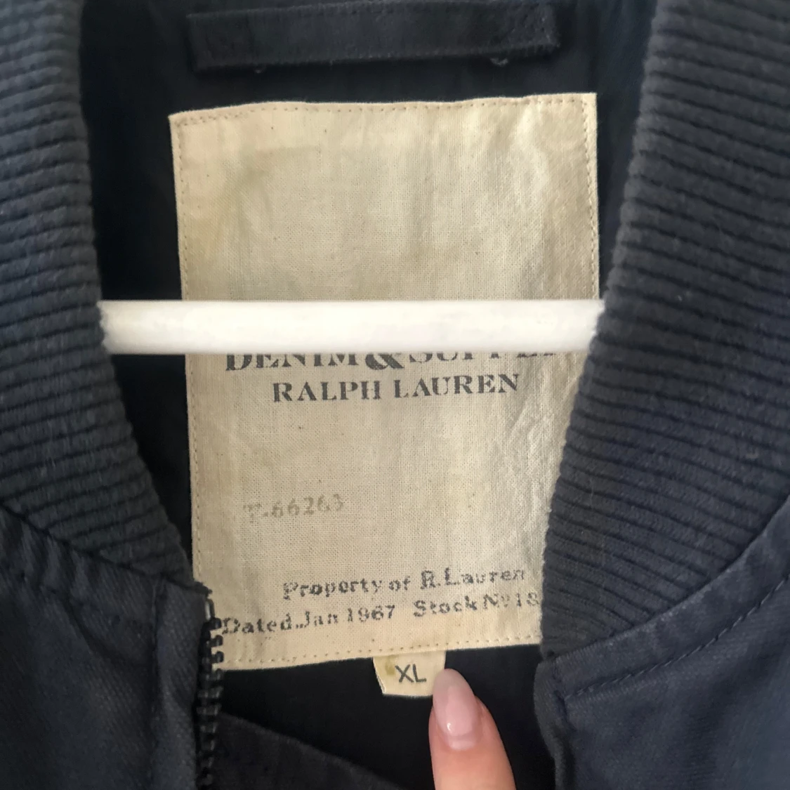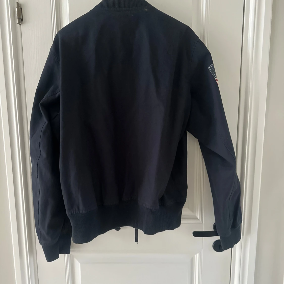 Säljer en svart bomberjacka från Ralph Lauren med en amerikansk flagga på ärmen. Jackan har dragkedja och ribbade muddar vid ärmslut och nederkant. Perfekt för en stilren look.