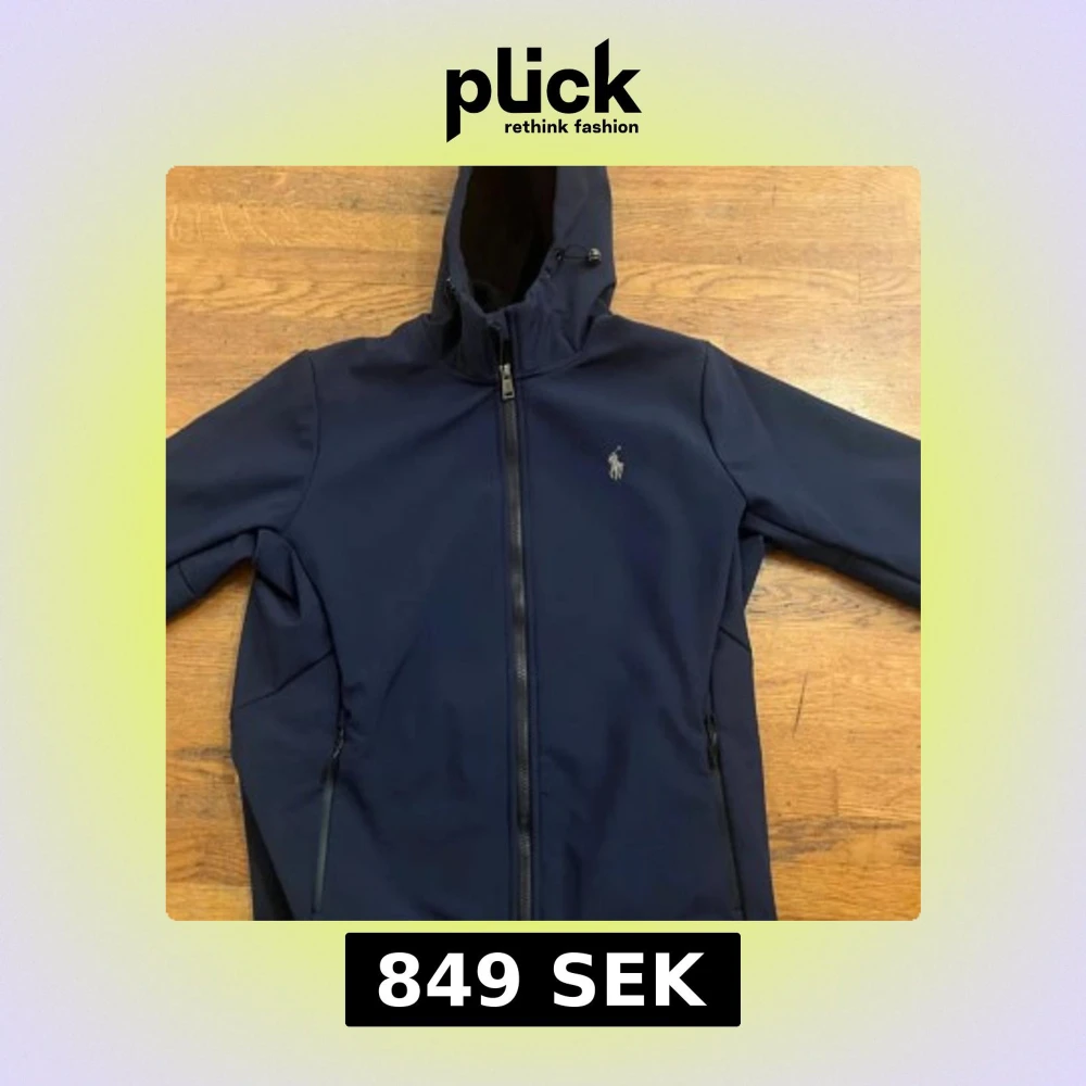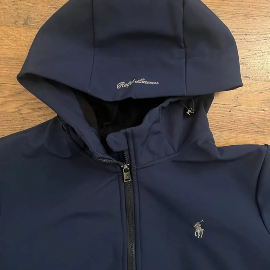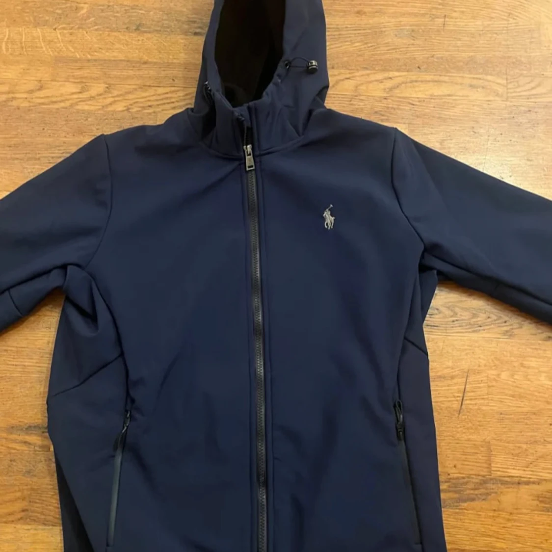 Säljer en stilren mörkblå jacka från Ralph Lauren med dragkedja och huva. Jackan har en broderad logotyp på bröstet och är perfekt för kyligare dagar. Den är långärmad och har en modern passform. Passar från 160-175. QR kod finns(se bild).