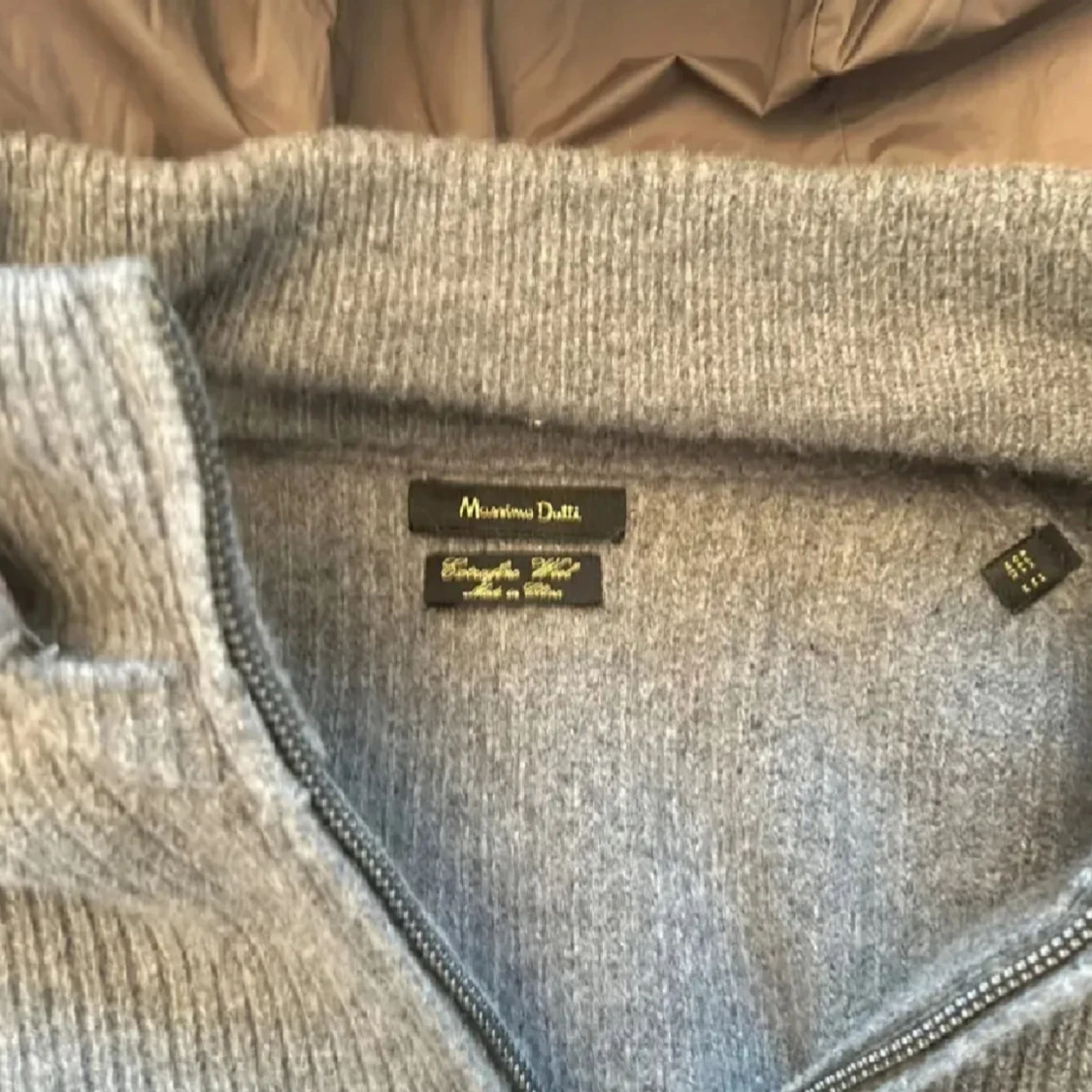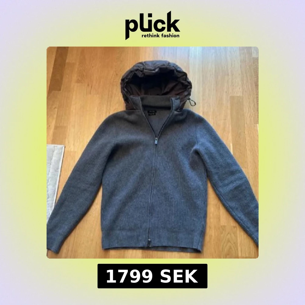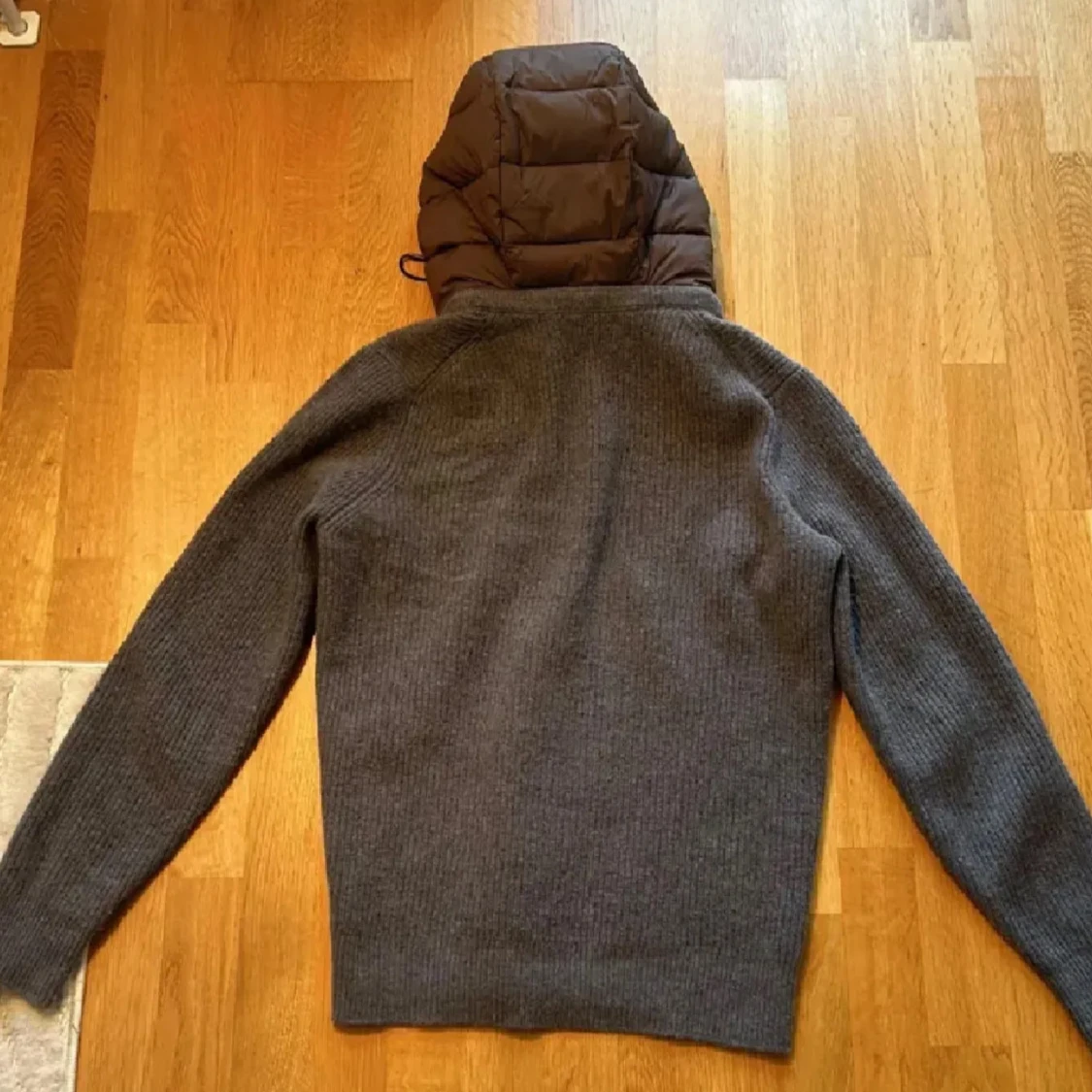 Säljer en grå stickad hoodie från Massimo Dutti med dragkedja och quiltad huva. Jackan är i storlek L, men sitter bättre som M.