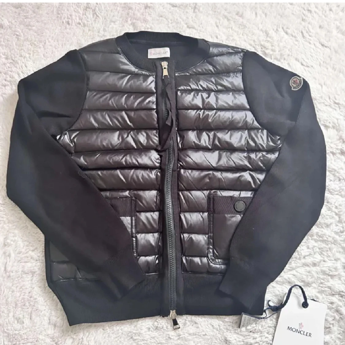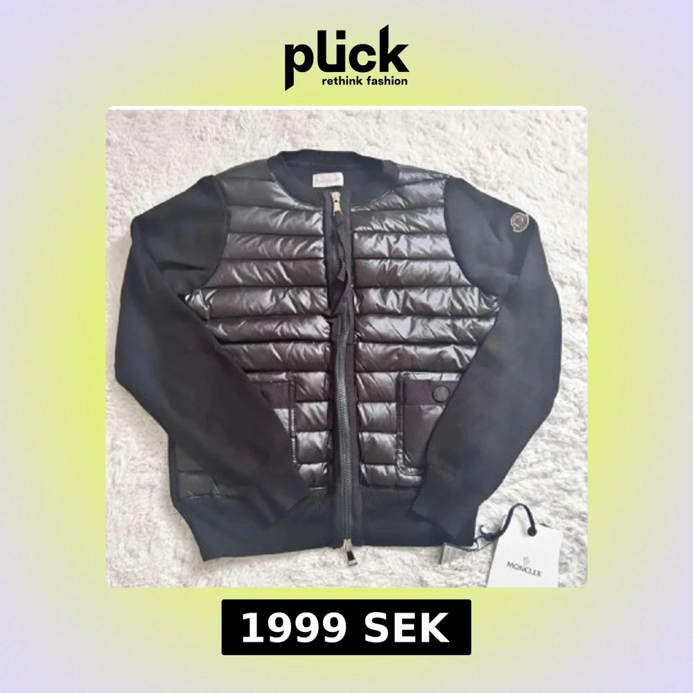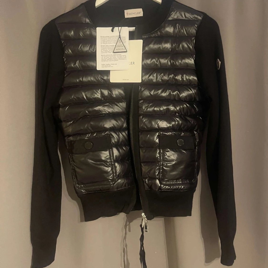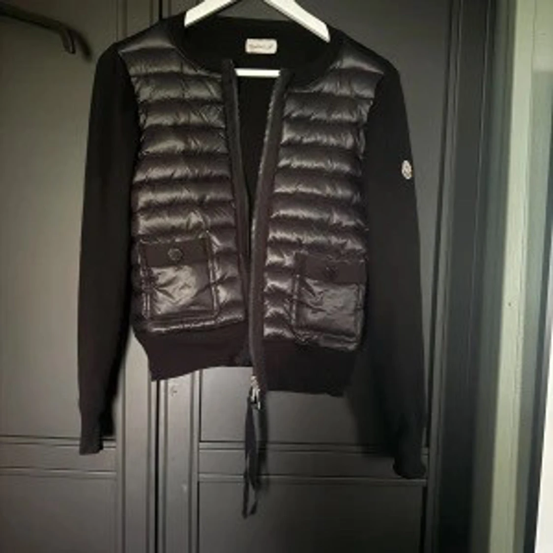 Jag säljer min Moncler cardigan 🖤. Den är svart med quiltad, lite glansig front, dragkedja fram och två söta fickor med knappar. Stickade ärmar och ribbade muddar gör den både mysig och stilren. Självklart med den klassiska Moncler-loggan på ärmen 🤍. Den är perfekt om du vill ha en lyxig men ändå vardagssnygg look ✨. Säljer bara för att jag har lite för många jackor 🙈.