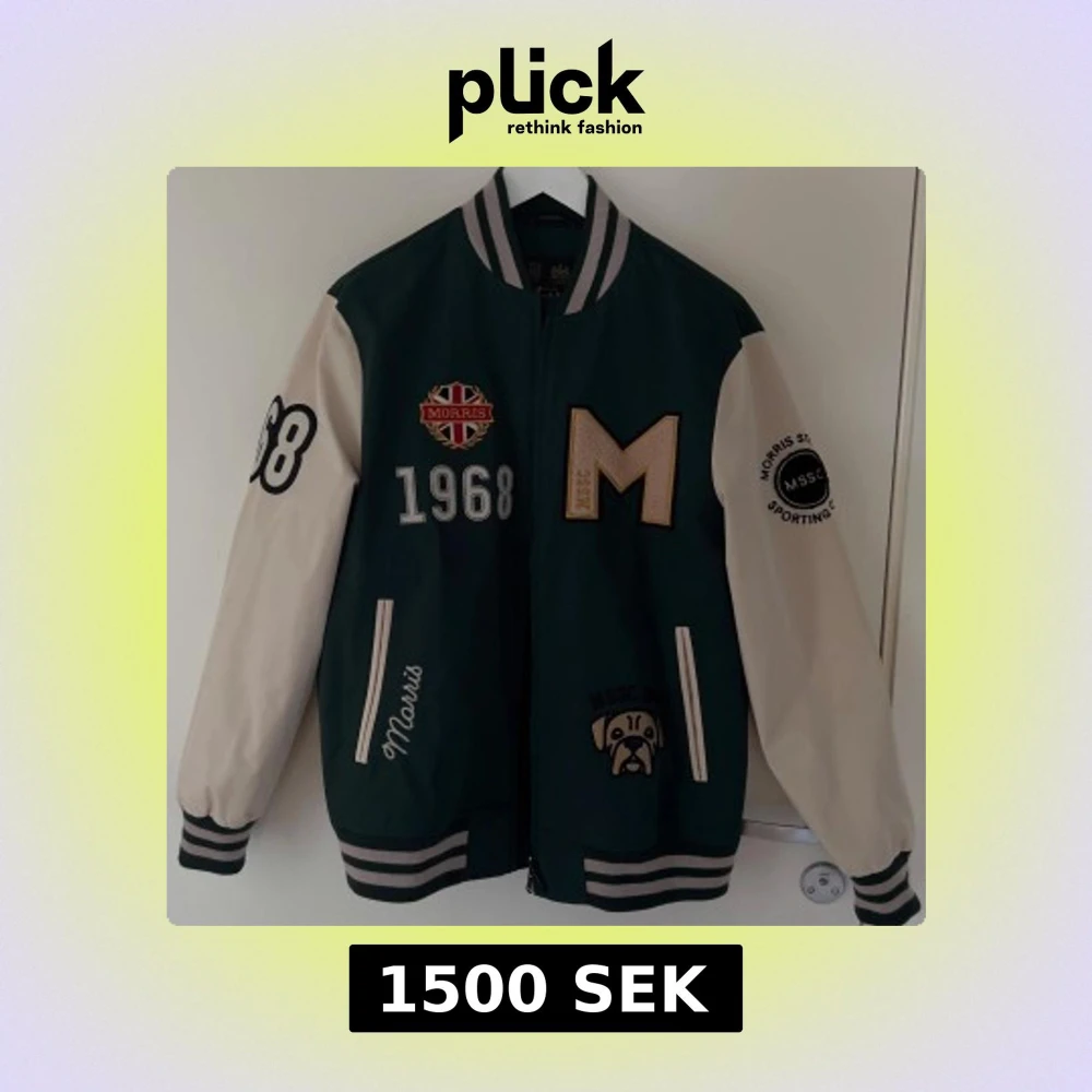 Tja jag säljer en varsityjacka från Morris som kostade runt 3000, jackan har använts max 10 gånger då jag inte hade några passandehoodies. Några saker jag vill påpeka är att den har små svarta märken på högra armen, dem är knappt synliga 1 meter ifrån dock & jag har inte testat att tvätta bort dem. Interiören i verkligheten är guldfärgad samt att alla detaljerna är broderade, jag skulle även klassa jackan som en m då jag har inga som helst problem att ha en oversized hoodie under och själv är s.