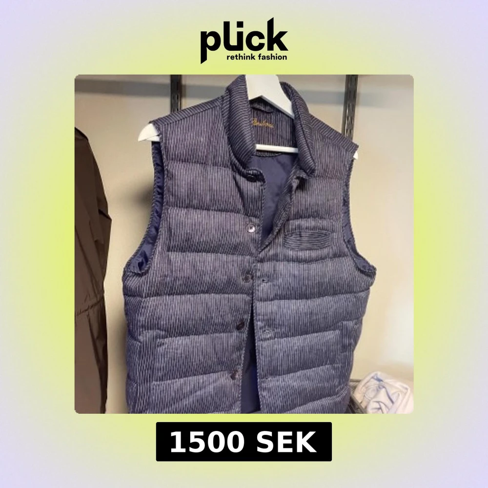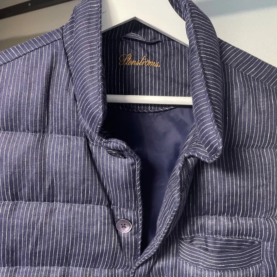 Snygg dunväst från Stenströms i mörkblått med tunna vita ränder. Västen har en klassisk krage, knäppning framtill och en liten bröstficka. Perfekt för lager-på-lager och ger en stilren look.