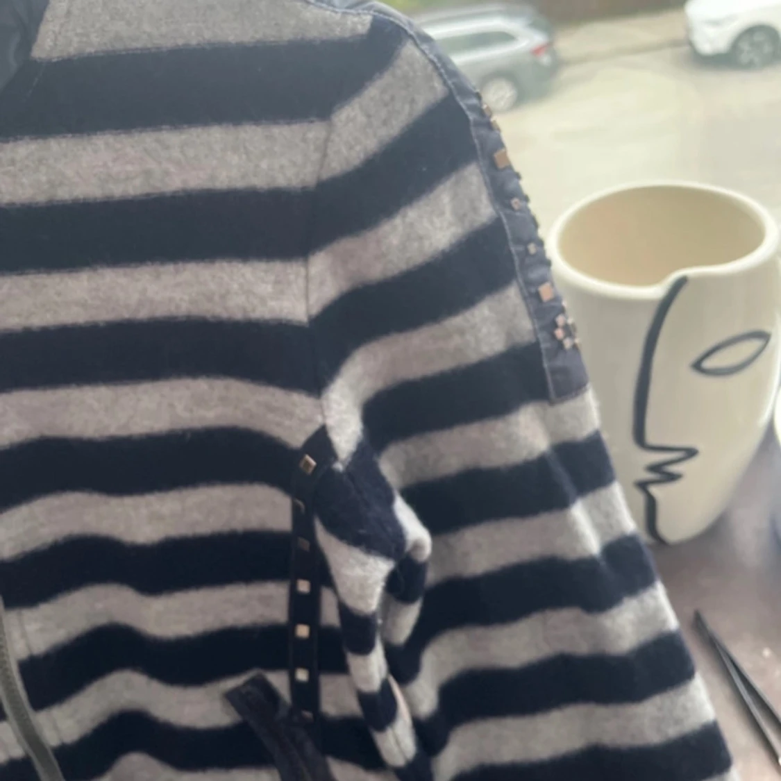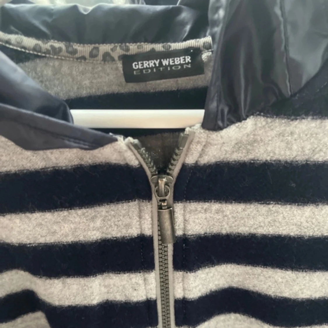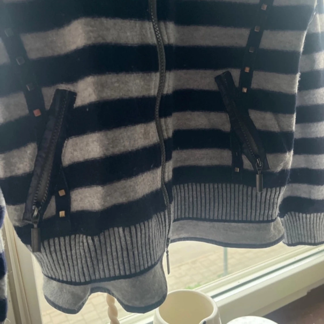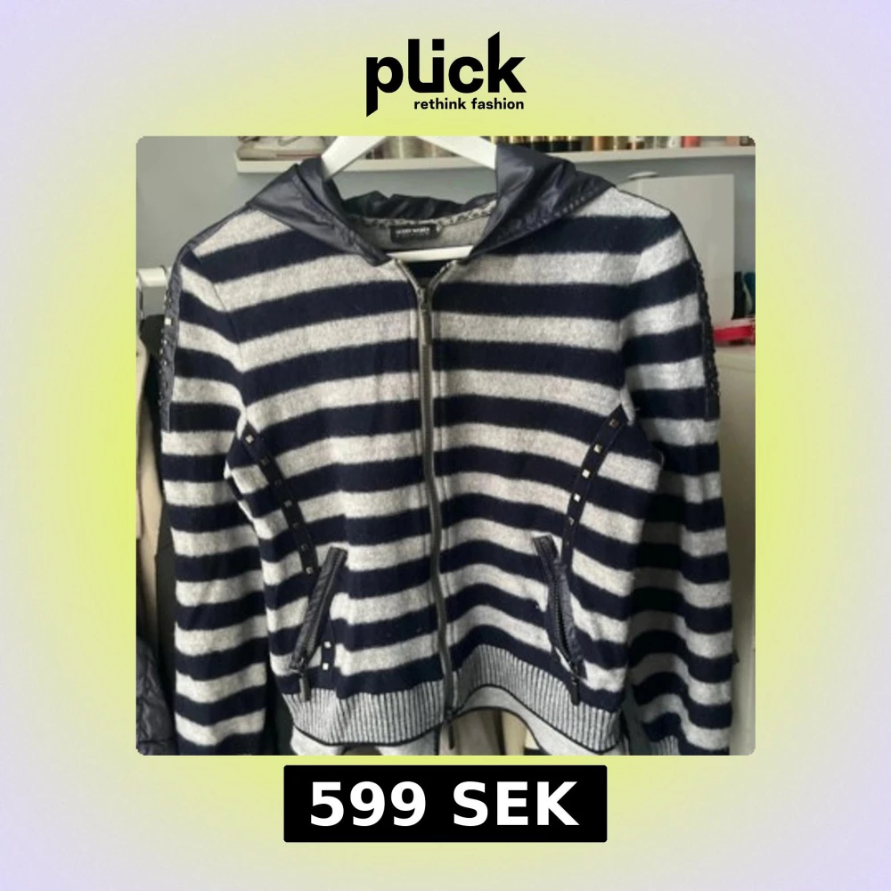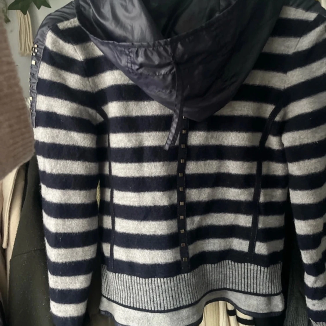 Mysig hoodiejacka med breda marinblå och grå ränder, dragkedja framtill och huva i glansigt material. Jackan har dekorativa nitar längs fickor och ärmar samt ribbade muddar. Jackan/koftan köpte ja för 2 tusen och den är i ull, luvan går att justera. Den säljs inte längre!