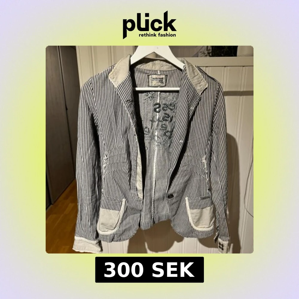 Säljer en snygg randig kavaj från Desigual i blått och vitt. Kavajen har en unik design med broderade detaljer på insidan och kontrasterande fickor och krage. Perfekt för dig som vill sticka ut med stil!