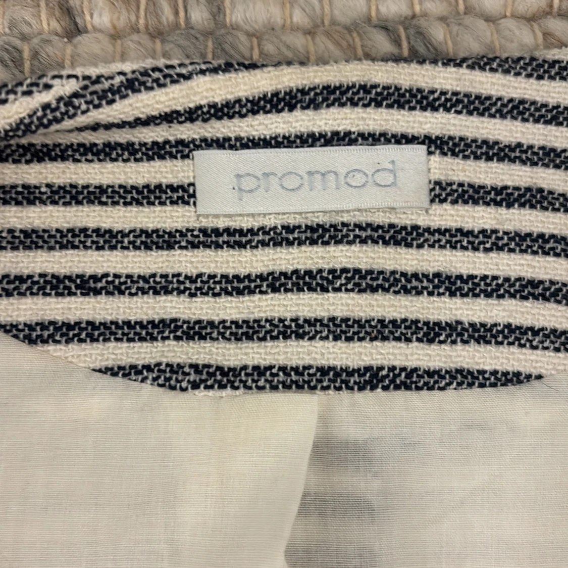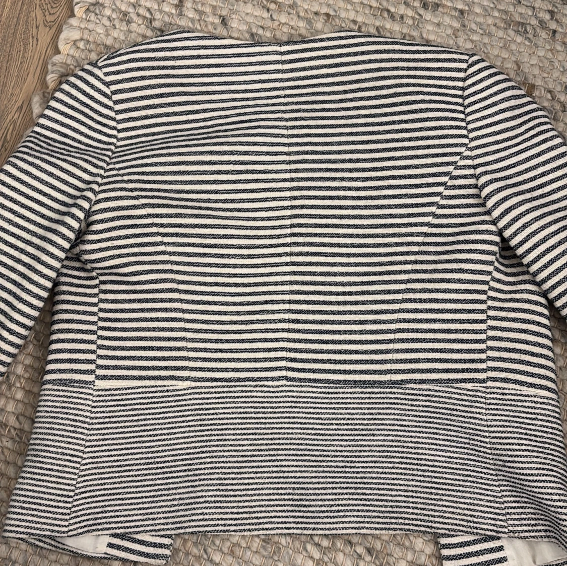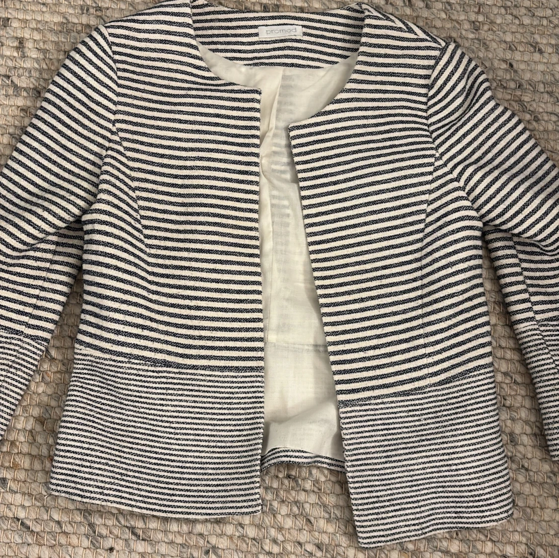Snygg randig kavaj från Promod i svart och vit. Den har en stilren design utan knappar och är perfekt för en chic look. Kavajen har långa ärmar och en normal passform. Perfekt för att ge din outfit en elegant touch.