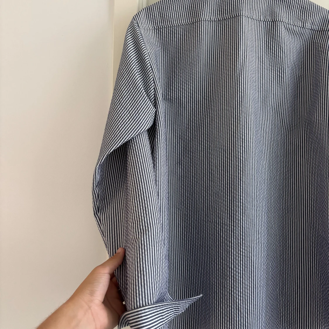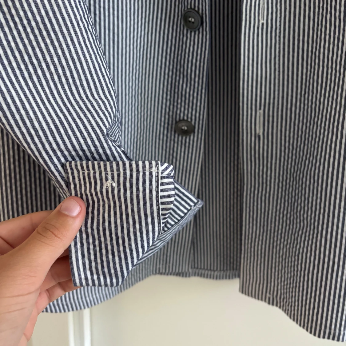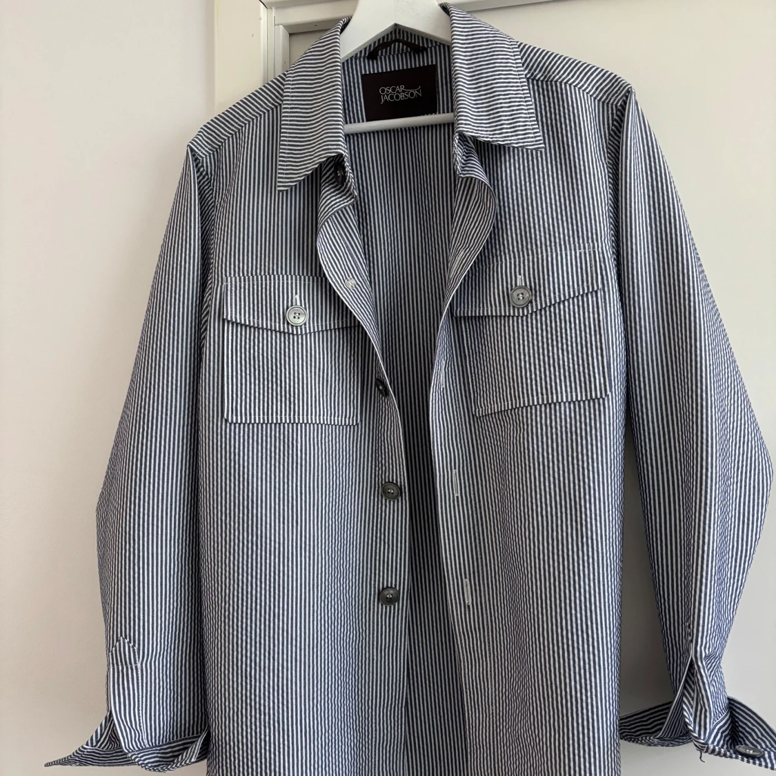 Snygg randig overshirt från Oscar Jacobson i blått och vitt. Jackan har klassisk skjortkrage, två bröstfickor med knappar och långa ärmar med manschett. Perfekt lager-på-lager-plagg för vår och sommar. Tillverkad i bomull för en lätt och luftig känsla. Nypris 3599