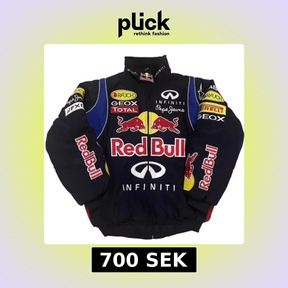 Snygg Red Bull racing vindjacka med stora broderade loggor och färgglada detaljer. Jackan är mörkblå med inslag av rött, gult och vitt, har dragkedja framtill och höga muddar. Perfekt för dig som gillar motorsport och vill sticka ut med en sportig look. Det är helt ny och oanvänd. Det är M i storlek men passar som oversize till tjejer som har storlek S-M eller 34-36. Väldigt varm jacka det passar till vår, höst och i vinter! Fråga om ni vill ha mer bilder.