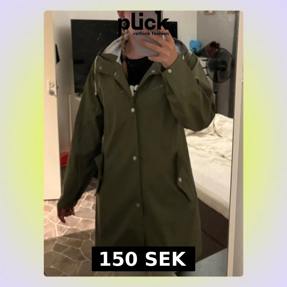 Snygg olivgrön regnjacka med huva och tryckknappar framtill. Jackan har två stora fickor med lock och en rak, loose passform. Perfekt för regniga dagar och enkel att matcha med olika outfits.