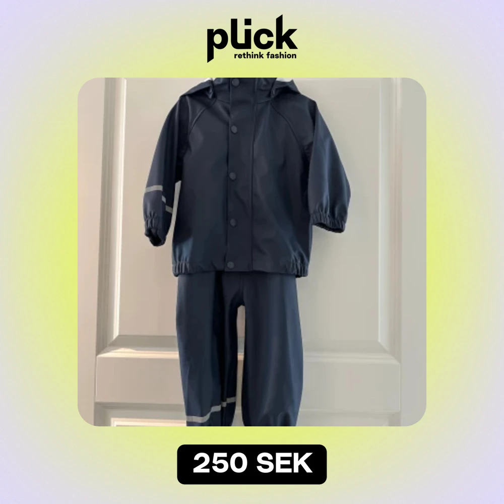 Regnställ från Name It storlek 80. Marinblått galon set med byxor och jacka . Byxorna har hällor och hängslen. Luvan i jackan fästs med knappar. Mycket fint skick, sparsamt använd. En liten fläck på ärmen som var på den vid köp.