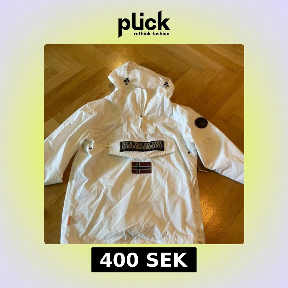 Säljer en vit vindjacka från Napapijri med stor huva och dragkedja vid halsen. Jackan har en stor ficka framtill med logotyp och norsk flagga, samt en patch på ärmen. Perfekt för blåsiga dagar.