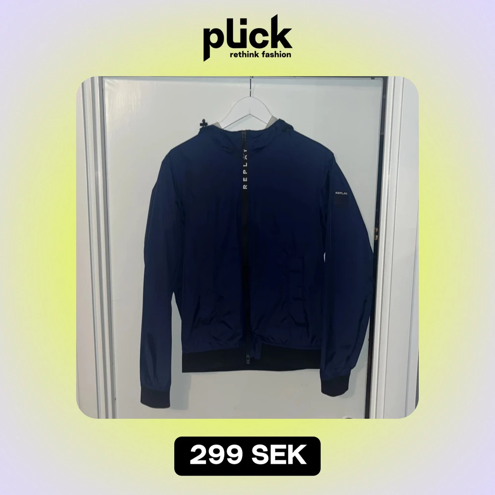 Säljer en snygg blå vindjacka från Replay. Den har en dragkedja framtill och en justerbar huva. Perfekt för vår och höst! Jackan är i bra skick men sömmen till vänsterfickan har lossnat men inget man märker (Bild 3)