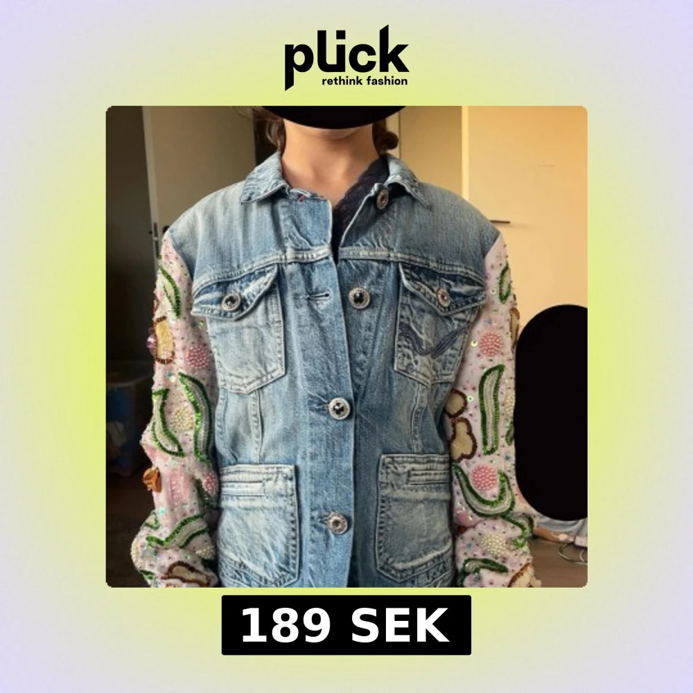 Unik jeansjacka från Replay med ljusblå tvätt och broderade ärmar i rosa tyg. Ärmarna har blommiga mönster, pärlor och paljetter i grönt, gult och rosa. Klassisk krage, knappar framtill och fyra fickor. Perfekt statement-plagg för dig som vill sticka ut.