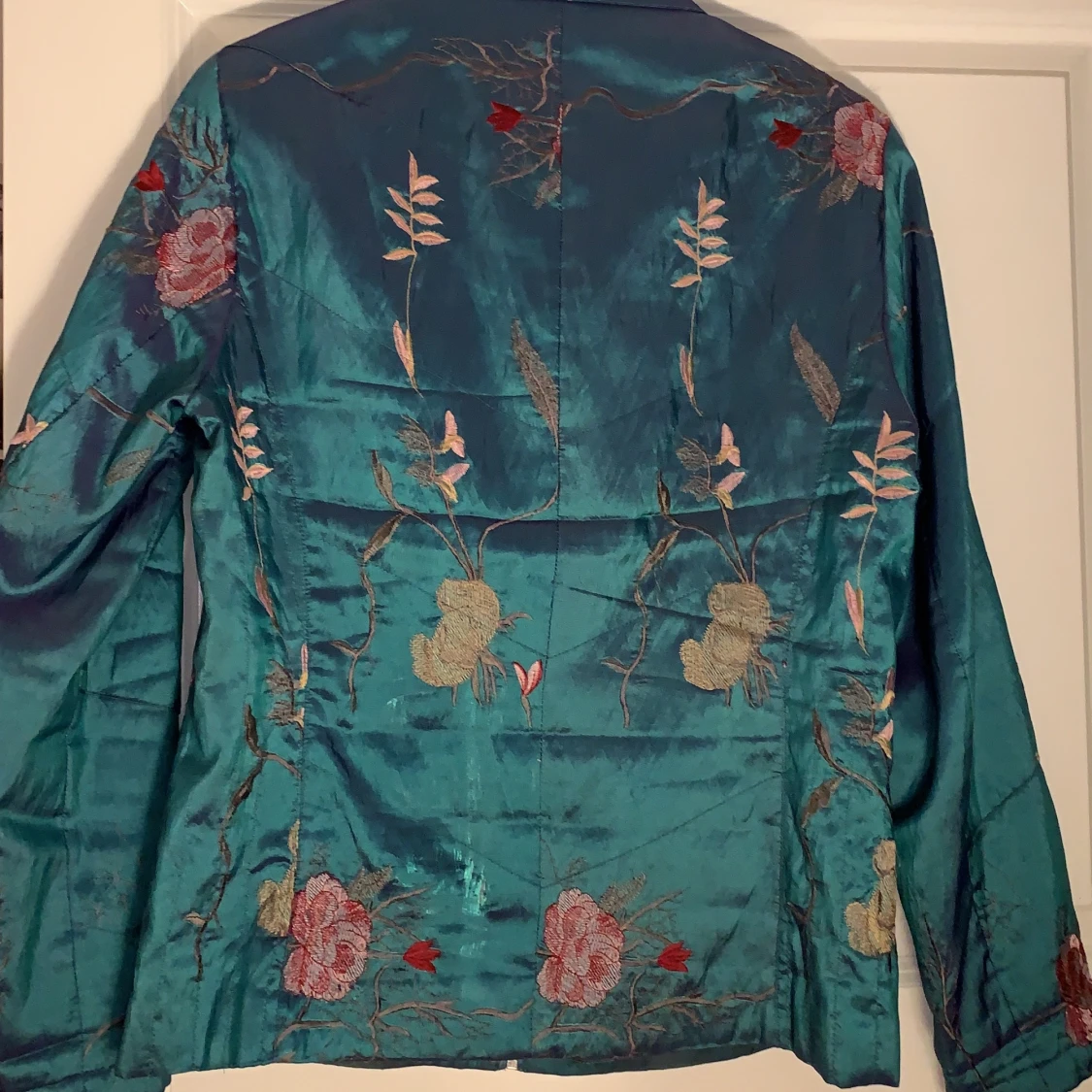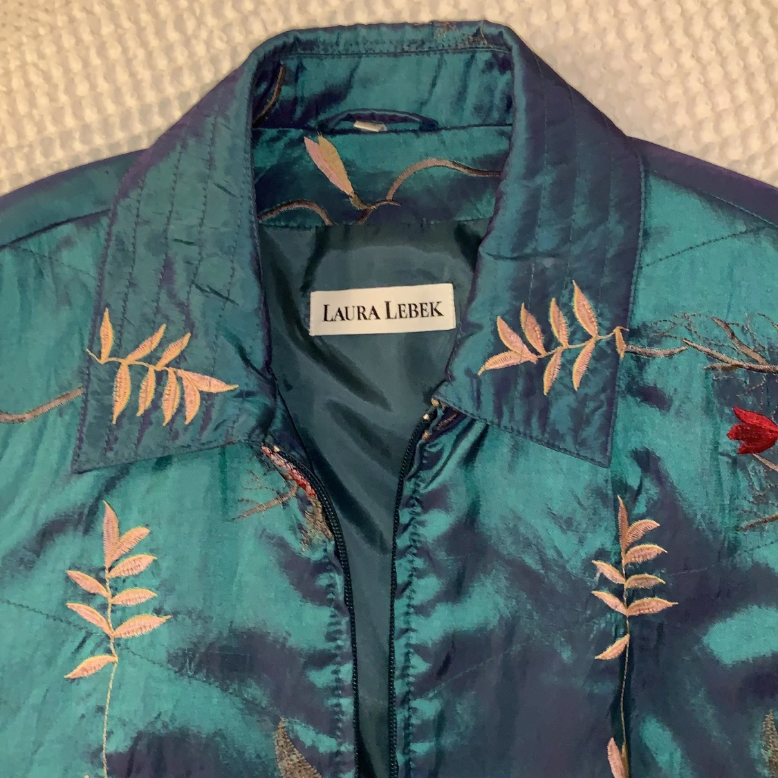 En jättesnygg och unik tunnare vintage jacka! Från ett märke som heter Laura Lebek och har små axelvaddar och skimrar i grönt och blått! Använd bara ett fåtal gånger då den är lite tajt på mig tyvärr. Gissar att den är från 90-talet o sitter som en Small✨ / Lisa