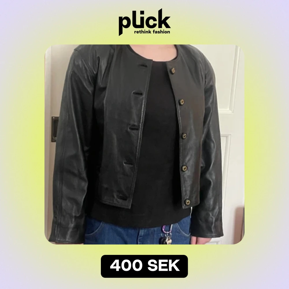 Välvårdad kort 90-talsjacka i mjukt svart läder, fodrad, med knappar och axelvaddar. 2 små ytterfickor, 1 innerficka. Kemtvätt. Superfint skick! Längd från halslinning fram 63 cm.