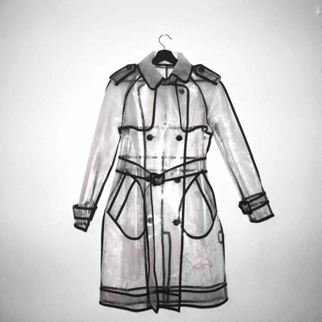 Coolaste regnjackan! Köpt second hand. Genomskinlig plast med svarta tygsömmar Plasten är lite dimmig här och var men den är fortfarande så cool.