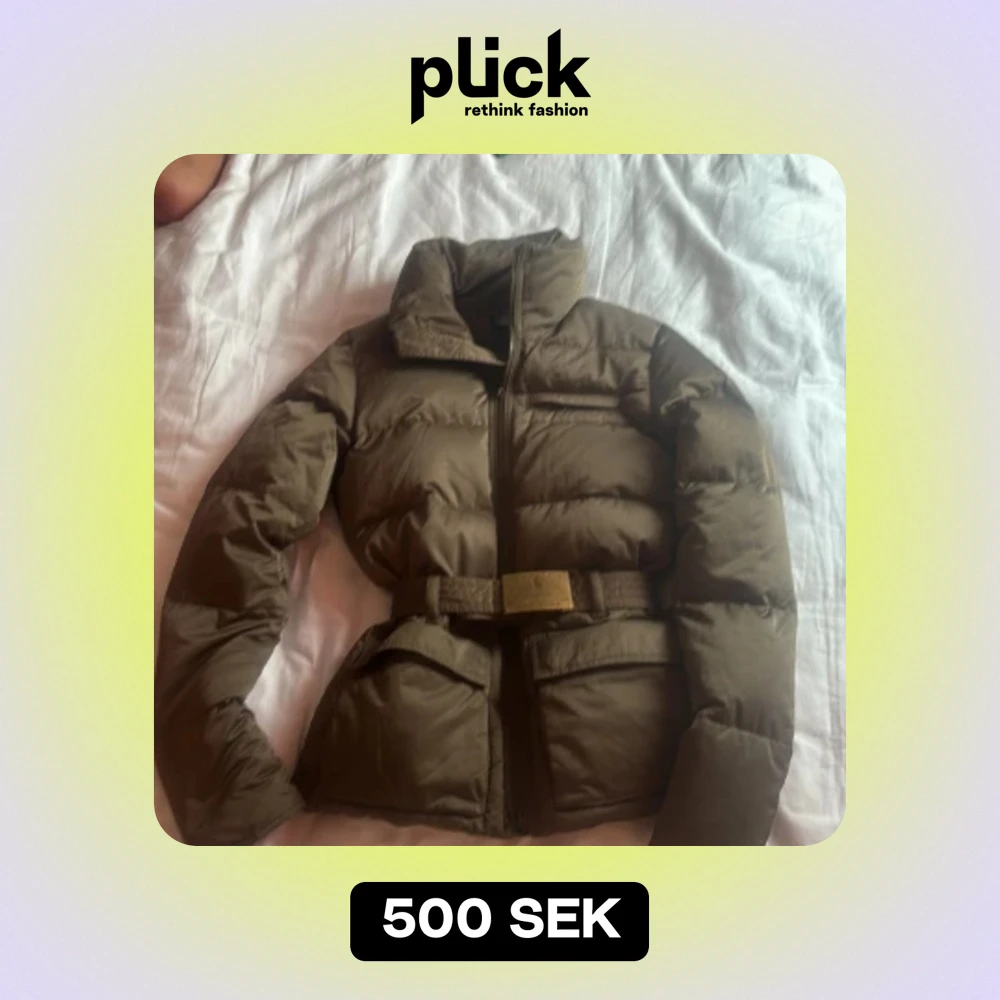 Jackan är i small . Jag köpte den här,men den va för liten. Den är grön, o haf ett fint bälte som gör hela jackan.