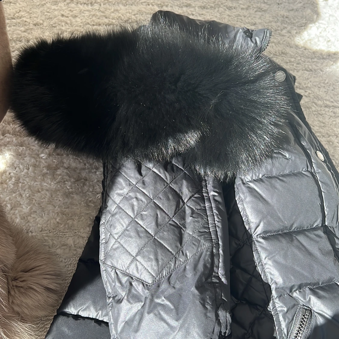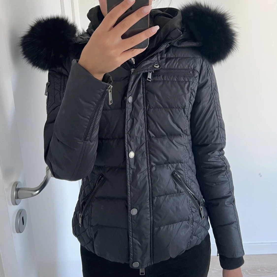 Svart kort dunjacka från märket rockandblue. Jag har sytt på egen äkta päls. Storlek 34.