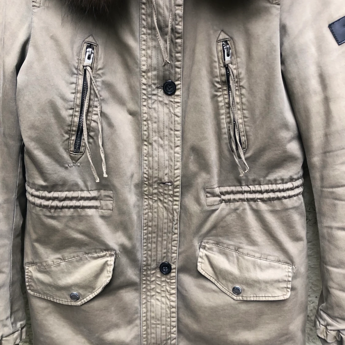 Rock&blue grön jacka i polyester. 80% dun och 20 % fjädrar Pälsen är brun och äkta. Nypris: 3450kr Använd i 2 vintrar. Dragkedjan funkar som den ska. Fattas två svarta knappar. Samt lite sliten vid armarna. (Kolla bilder) Storlek 34 ( XS )