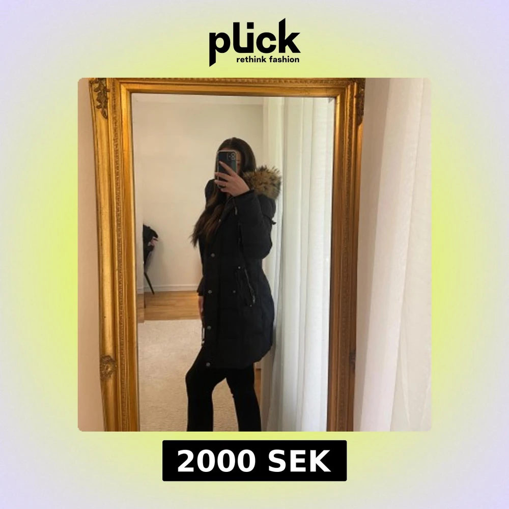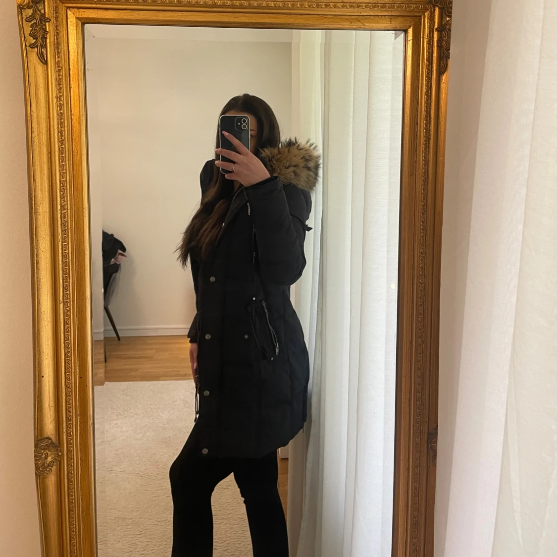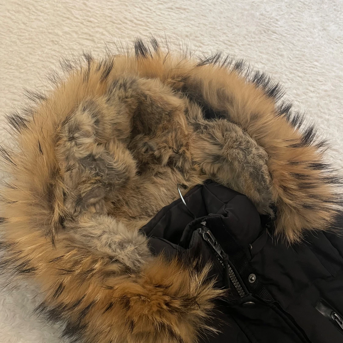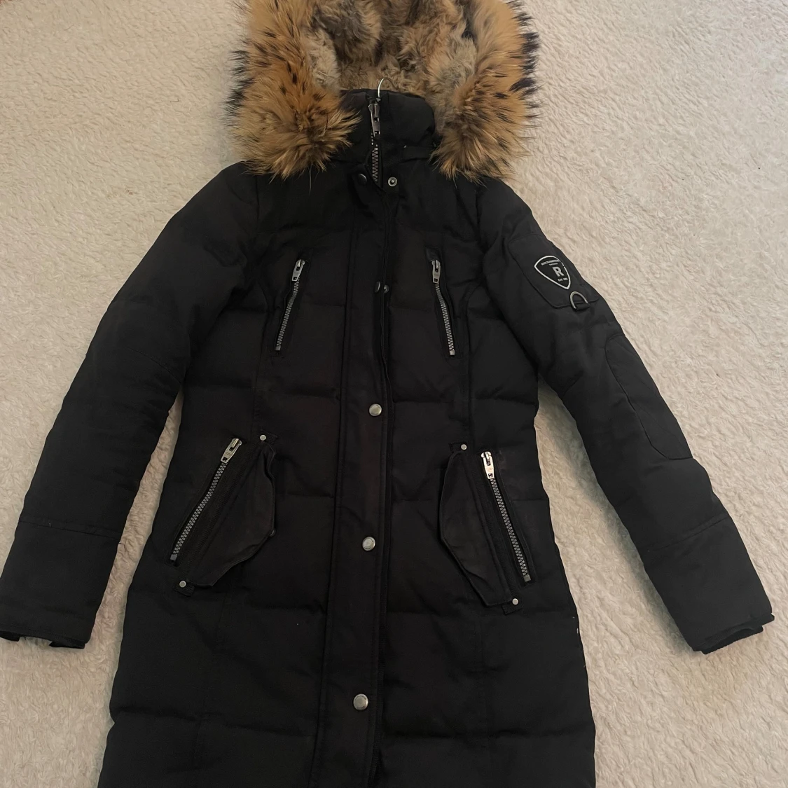 Svart lång Rock and blue jacka storlek 32 med stor huva och fluffig äkta päls i beige runt kragen. Jackan har dragkedja, knappar, fickor med lock och en extra ficka med dragkedja på ärmen. Perfekt för kalla vinterdagar och riktigt snygg siluett - ordinarie pris 5000