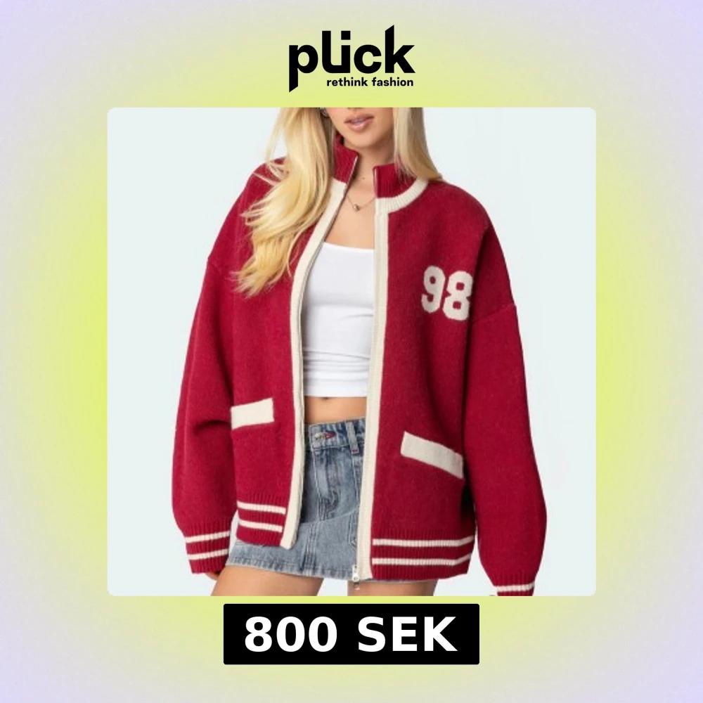 Röd cardigan jacka med vita ränder och siffran 98 på både fram- och baksida. Jackan har dragkedja, två fickor framtill och ribbade muddar. Oversized passform och sportig collegekänsla.