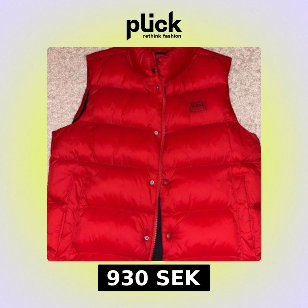 Snygg röd dunväst från Hugo med hög krage och tryckknappar framtill. Funkar till vår, sommar men även kyligare dagar. Använd väldigt få gånger då den är stor för mig. Ordinarie pris ca 3000, köpt på rea i butik för 2199.