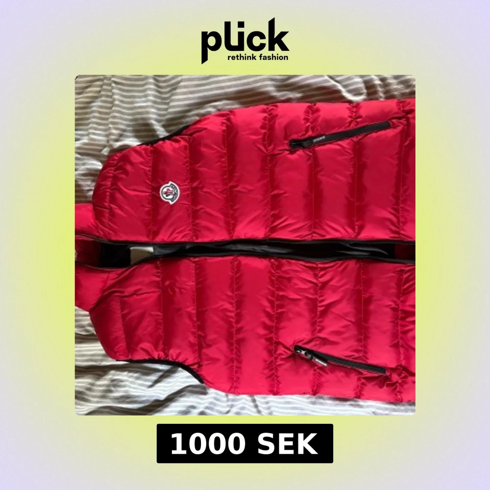 Säljer en röd dunväst från Moncler med klassisk logga på bröstet. Västen har svarta dragkedjor framtill och på fickorna, quiltad design och en cool serietidningsetikett på insidan. Perfekt för lager-på-lager och streetstyle. Pris kan diskuteras fraktar snabbt