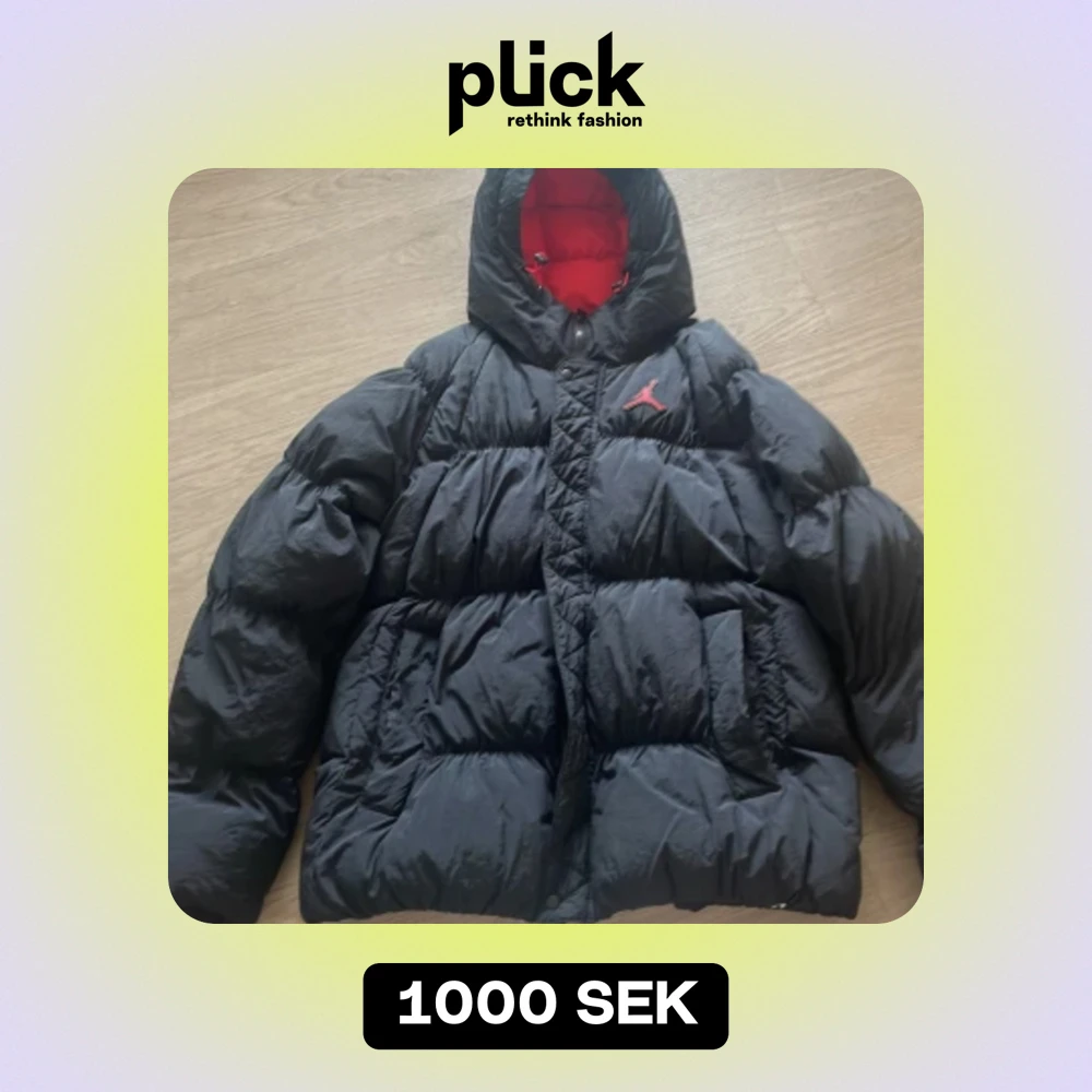 Säljer en snygg och varm svart pufferjacka från Jordan. Den har en cool röd logga på bröstet och en dragkedja med Jordan-detaljer. Insidan av huvan är röd, vilket ger en schysst kontrast. Perfekt för kalla vinterdagar!