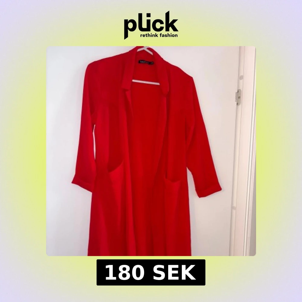 Snygg röd kappa i blus liknande material från Boohoo med lång passform och stora fickor framtill. Jackan har en öppen front utan knäppning och är tillverkad i ett lätt, strukturerat tyg som känns skönt mot huden. Perfekt för dig som vill sticka ut med färg i din outfit. Oanvänd
