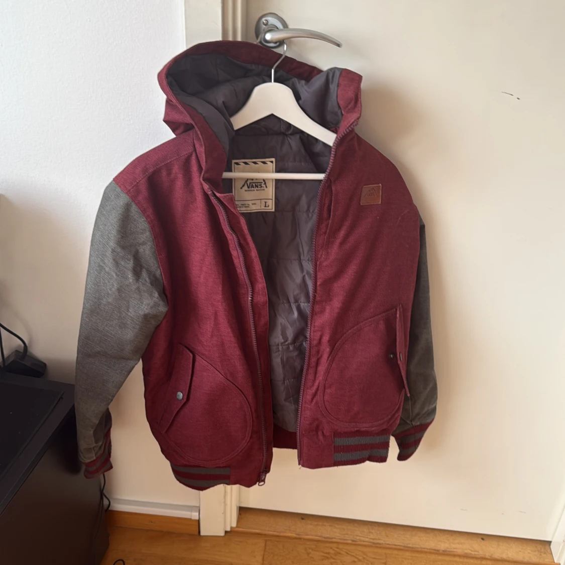 Säljer en snygg röd och grå jacka från Vans med huva och dragkedja. Jackan har långa ärmar och praktiska fickor framtill. Perfekt för höst och vår!