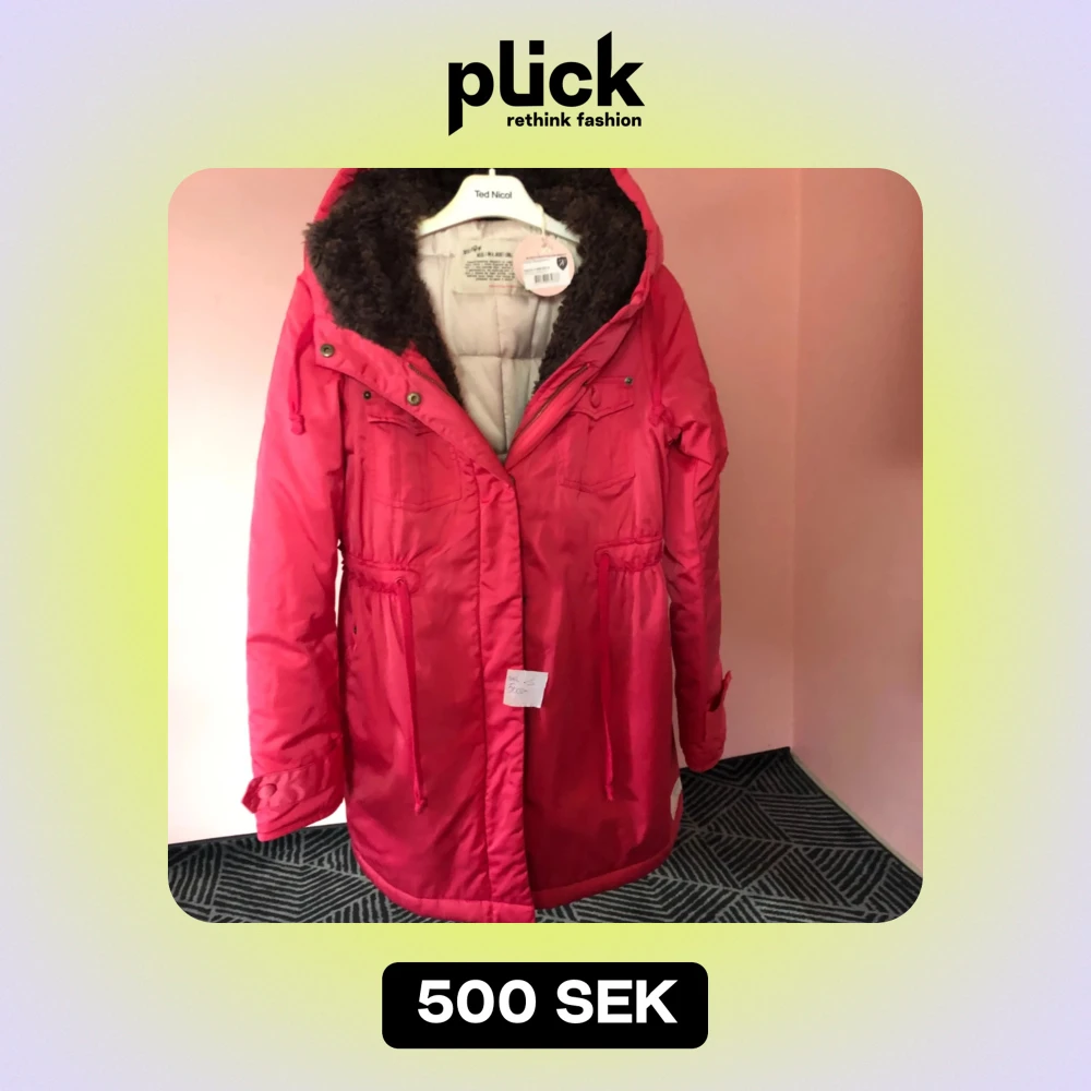 Snygg röd parkajacka från Ted Nicol med mysigt foder och huva. Jackan har dragkedja och knappar framtill samt justerbar midja för perfekt passform. Perfekt för kyliga dagar!