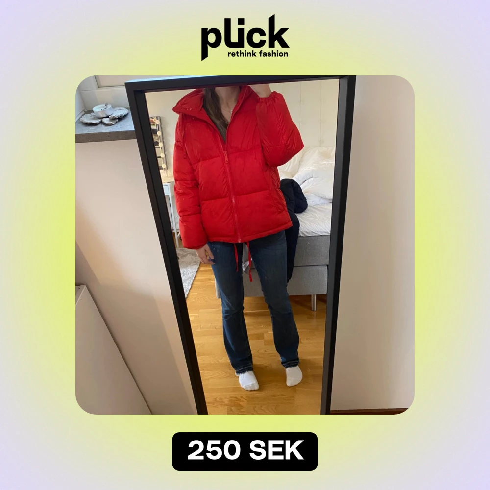 Säljer en snygg röd pufferjacka som är perfekt för vintern. Jackan har en dragkedja framtill och en justerbar huva. Den är varm och bekväm, idealisk för kalla dagar. Passar bra till både vardag och mer avslappnade tillfällen.